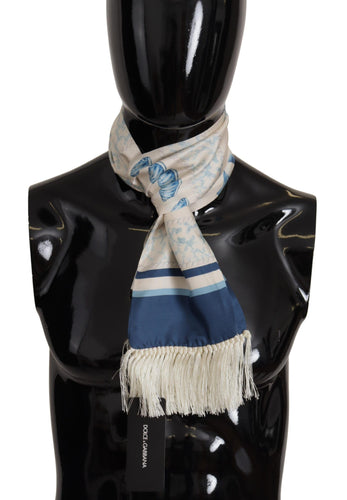 Dolce & Gabbana Blue Silk Shiny Shell-Print Neck Wrap Fringed Scarf