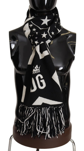 Dolce & Gabbana White Black DG Logo Star Printed Wool Fringe Scarf