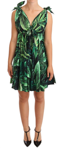 Dolce & Gabbana Green Leaves Print Cotton Flared Mini Dress
