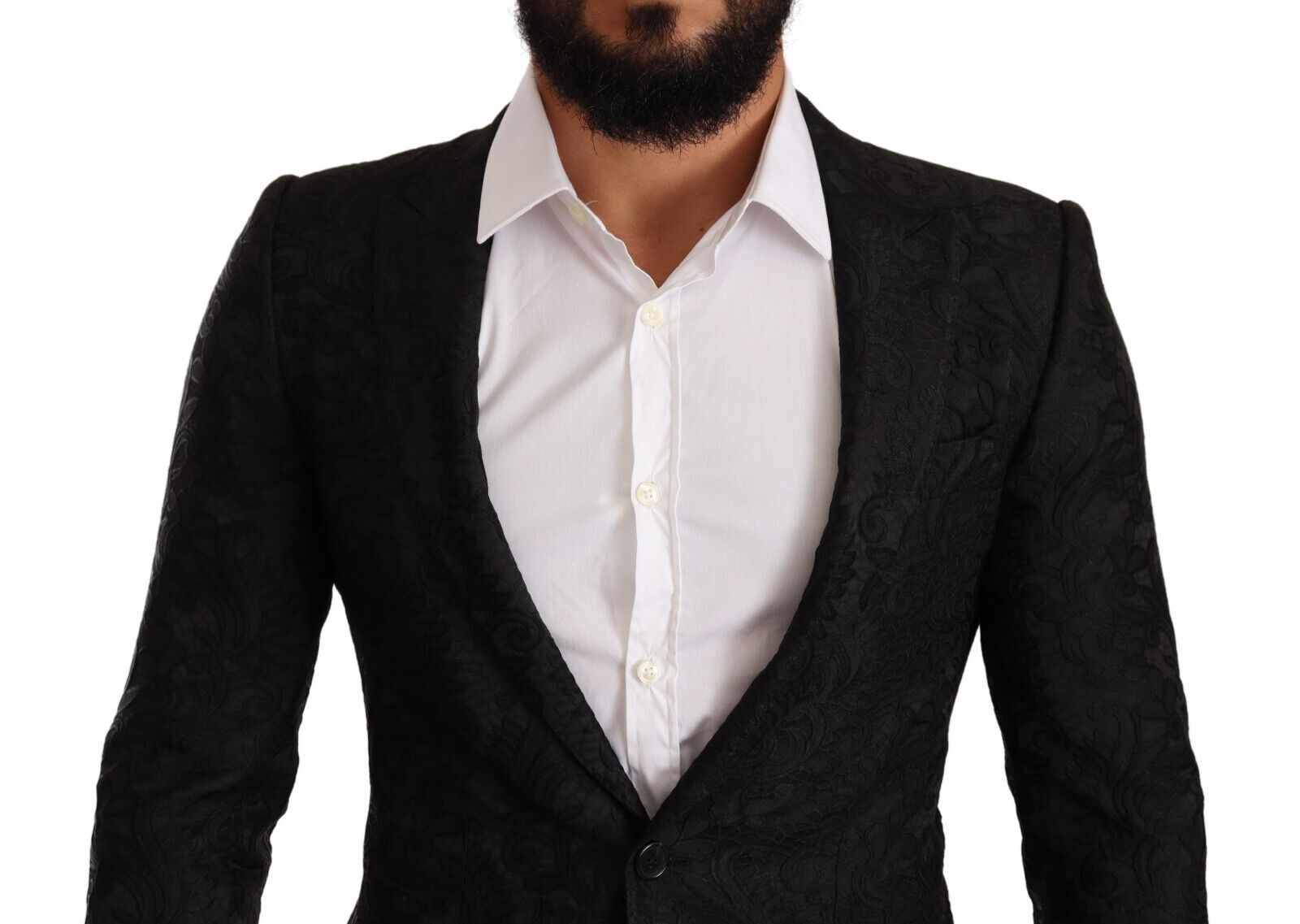 Indulge in luxury with this exquisite Dolce & Gabbana MARTINI black floral pattern blazer. Meticulously crafted in Italy, this slim-fitting jacket showcases a sophisticated single-breasted design with two buttons, perfect for any formal occasion. Tailored from a unique blend of high-quality materials, it features three external pockets, three internal pockets, and an elegant rear vent, ensuring both function and fashion. The blazer’s intricate floral pattern exudes a sense of luxury, complemented by the brand’s signature logo details. The interior is just as lavish, lined with a sumptuous blend of silk and viscose for exceptional comfort.