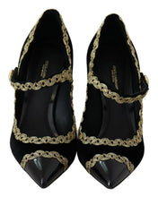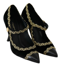 Indulge in the epitome of luxury with these exquisite Dolce & Gabbana Classic Mary Jane Pumps. Crafted with an eye for opulence, these pumps feature plush black velvet and patent textures, enhanced by iconic gold embroidery that traces along the uppers for a touch of baroque elegance. Detailed with pointed toes and gold-tone studded ankle straps, these stilettos exude sophistication. Not only stylish but also comfortable, these Italian-made shoes are an essential addition to your high-end fashion collection.