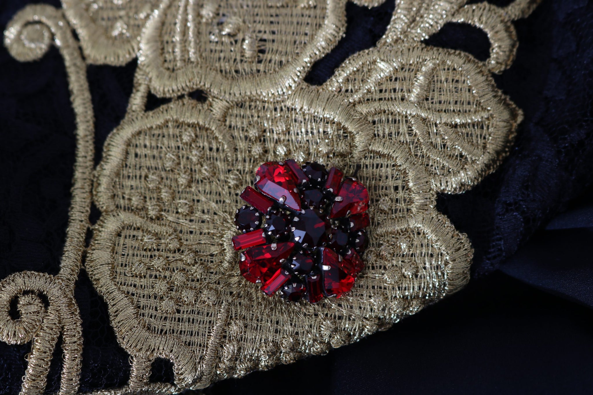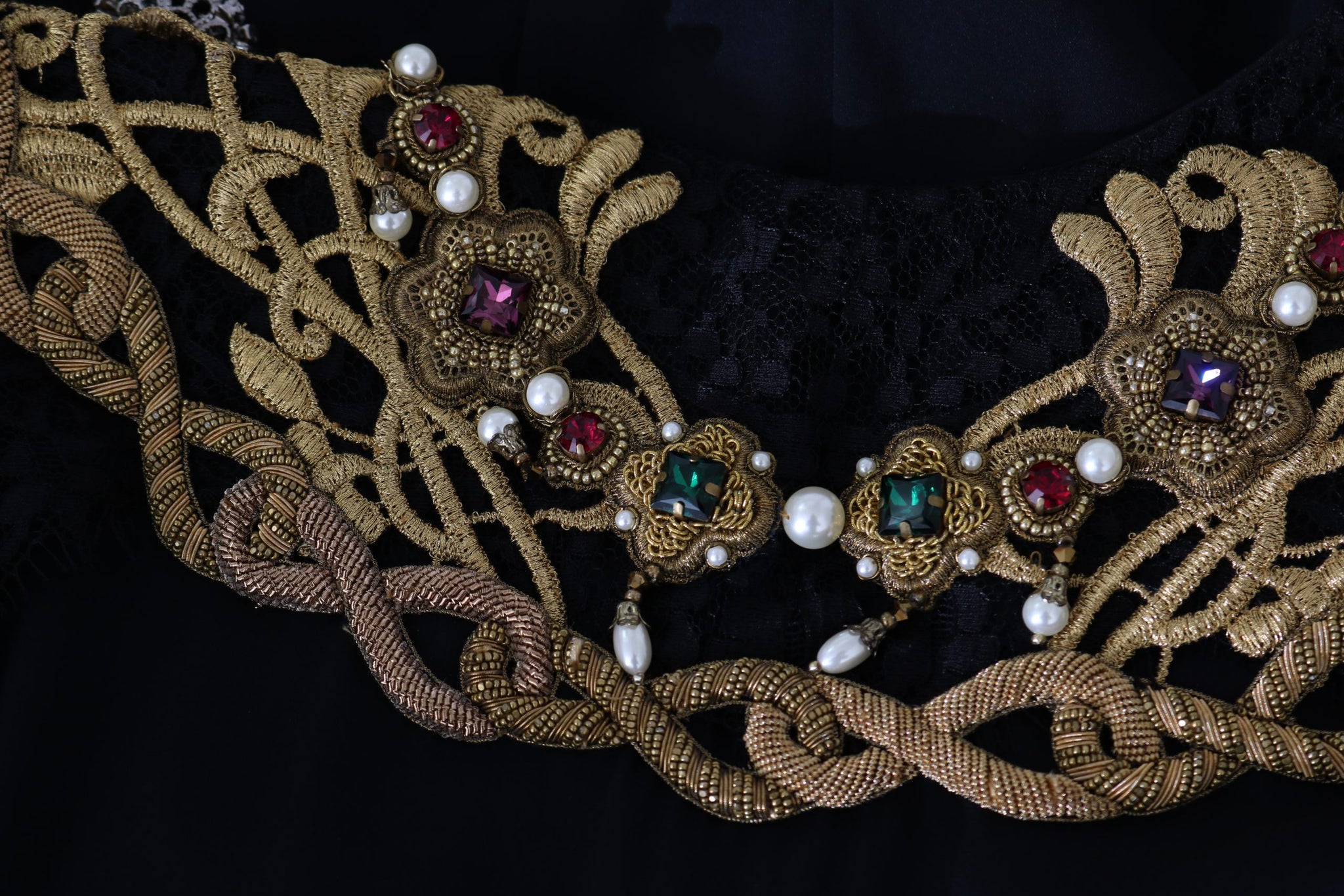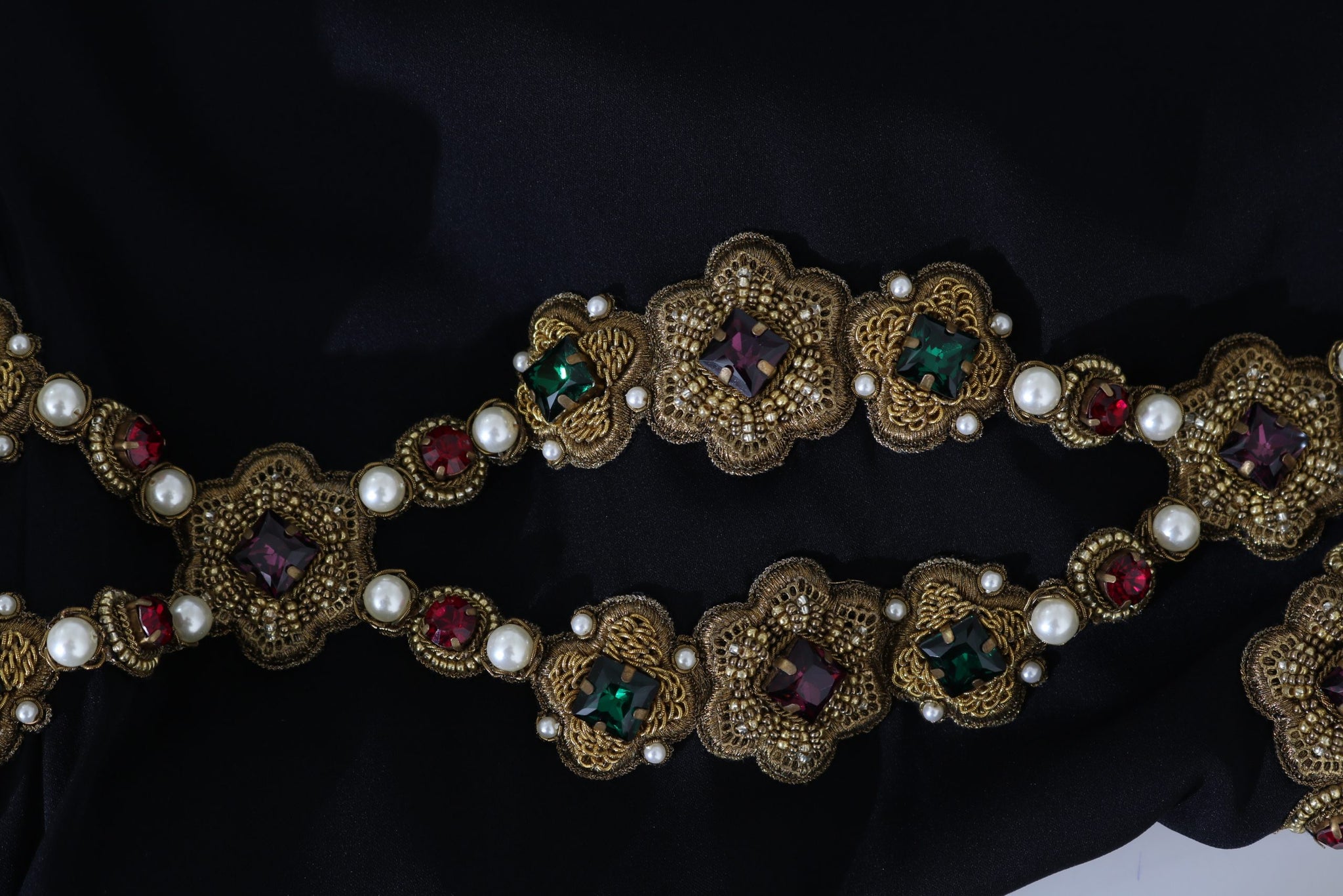 Step into luxury with this stunning Dolce & Gabbana maxi dress. The elegant black hue is complemented by opulent gold brass detailing and a dash of multicolored crystals for a truly glamorous look. Crafted in Italy, this piece epitomizes high-end craftsmanship, making it a must-have for any exclusive event. A zipper closure at the back ensures a sleek fit, while the dress’s premium material blend promises both comfort and style.
