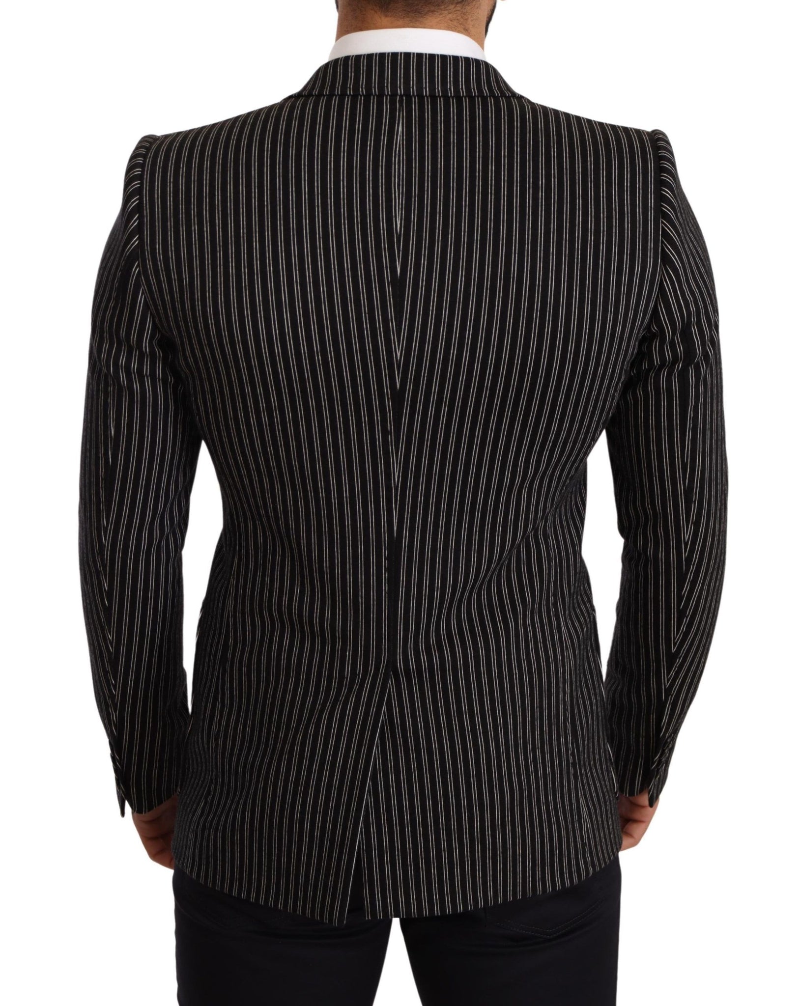 Elevate your wardrobe with this striking black striped blazer, a testament to the unparalleled elegance of Dolce & Gabbana. A perfect blend of style and craftsmanship, this slim fit piece is ideal for any formal occasion, showcasing a sharp notch lapel style. Each detail exudes luxury, from its sleek silhouette down to the luxurious silk lining. Crafted in Italy, this blazer is a quintessential representation of high-end fashion.
