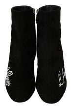 Step into luxury with these stunning black suede ankle boots by Dolce & Gabbana. Perfectly crafted in Italy, they feature exquisite white L’Amore E’Bellezza embroidery, a testament to love and beauty. Set on a pure leather sole, these high-quality boots offer unparalleled comfort and terrific attention to detail with their discreet logo. Dare to stand out with this elegant pair that speaks volumes of your impeccable taste in fashion.