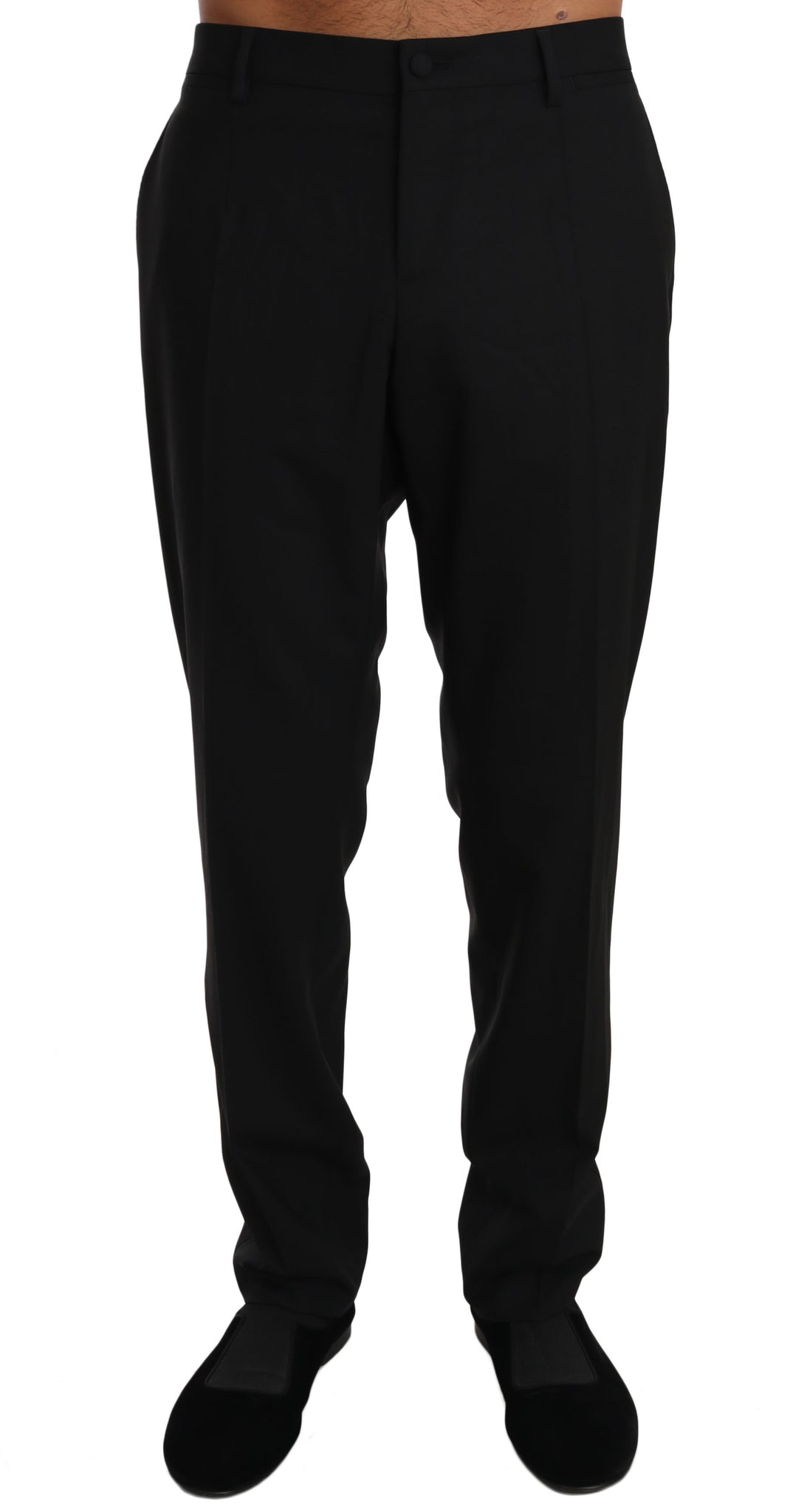 Indulge in the epitome of Italian craftsmanship with these Dolce & Gabbana formal dress pants. Tailored to perfection, these pants are a wardrobe staple for those seeking elegance and sophistication. The blend of 97% wool and 3% stretch ensures a comfortable fit that moves with you. A sleek black color provides unparalleled versatility, making these trousers a timeless addition to your formal attire.