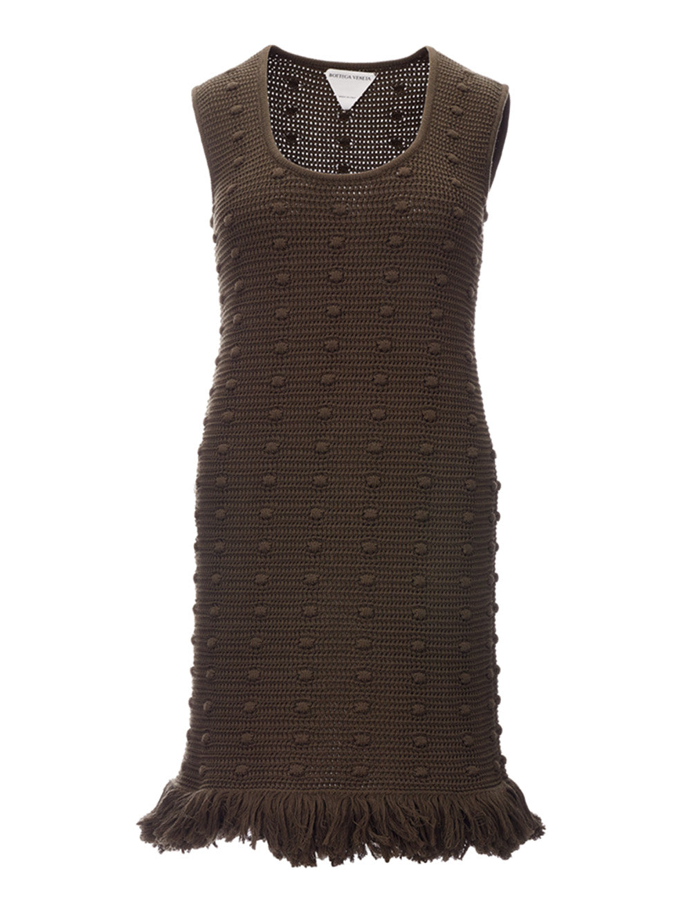 Indulge in the elegance of Bottega Veneta with this stunning olive green knit dress. Perfect for both a day at the office or a night out, this pencil-style dress is crafted from 100% luxurious cotton, ensuring both comfort and style. The unique fringes at the bottom add a touch of playfulness to this exquisite piece. Designed and made in Italy, it epitomizes high-end craftsmanship and sophistication.