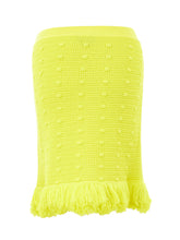 Indulge in Italian elegance with this exquisite Bottega Veneta skirt, perfect for adding a pop of color and a touch of playfulness to your wardrobe. Crafted from the finest 100% cotton, this skirt boasts an eye-catching yellow hue complemented by whimsical pompom details. The comfortable elastic waistband ensures a snug fit, while the fringed hem adds movement and a classic pencil cut provides a flattering silhouette suitable for any occasion.