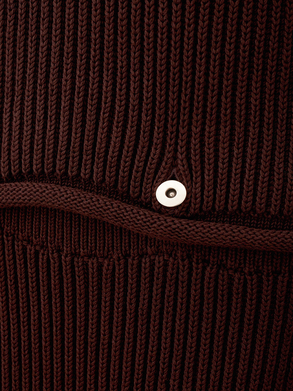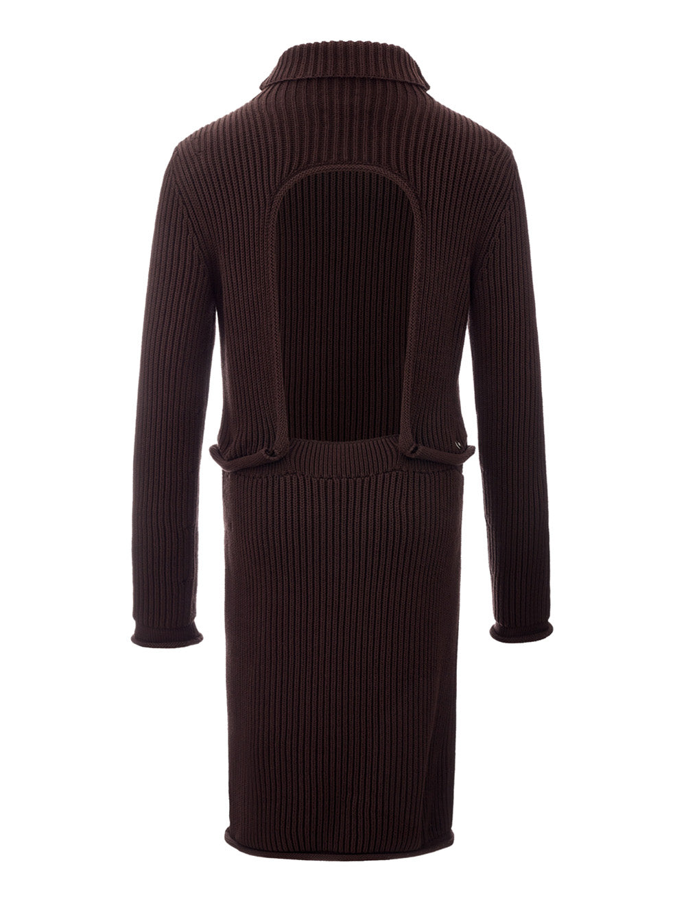 Indulge in the epitome of luxury and style with this exquisite Bottega Veneta Ribbed Knit Chunky Cotton Dress. Crafted from 100% premium cotton and made in Italy, this piece features a unique removable turtleneck top with elegant buttons, and a sophisticated open back design. The sleek pencil skirt cuts mid-length and is equipped with a comfortable elastic waistband, offering both style and ease. Perfect for any high-end gathering, this dress boasts a regular fit to accentuate your silhouette in a refined brown hue.