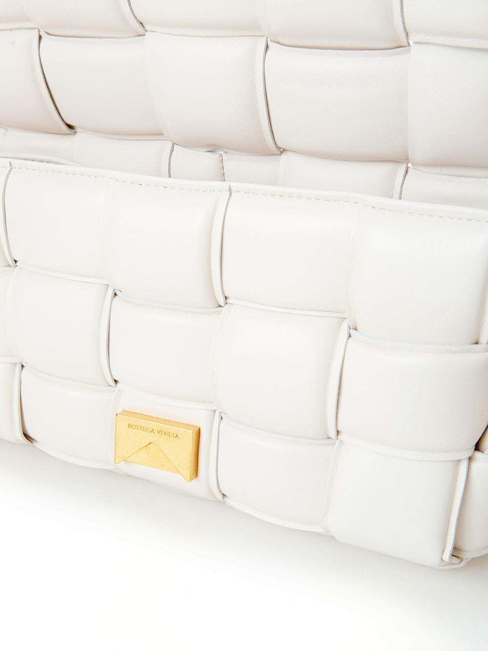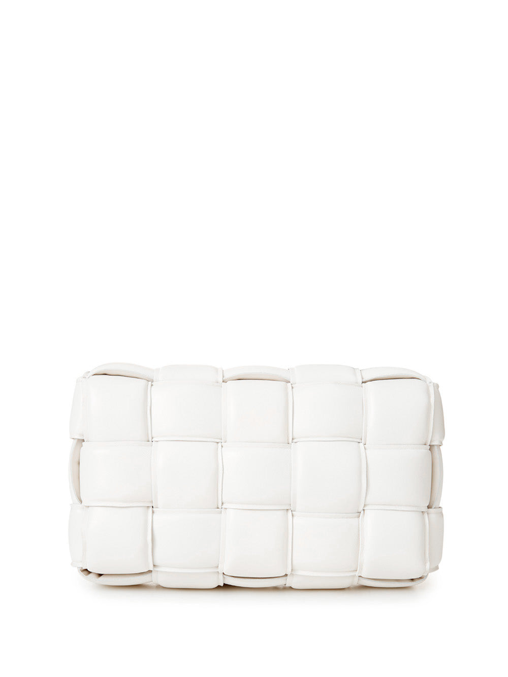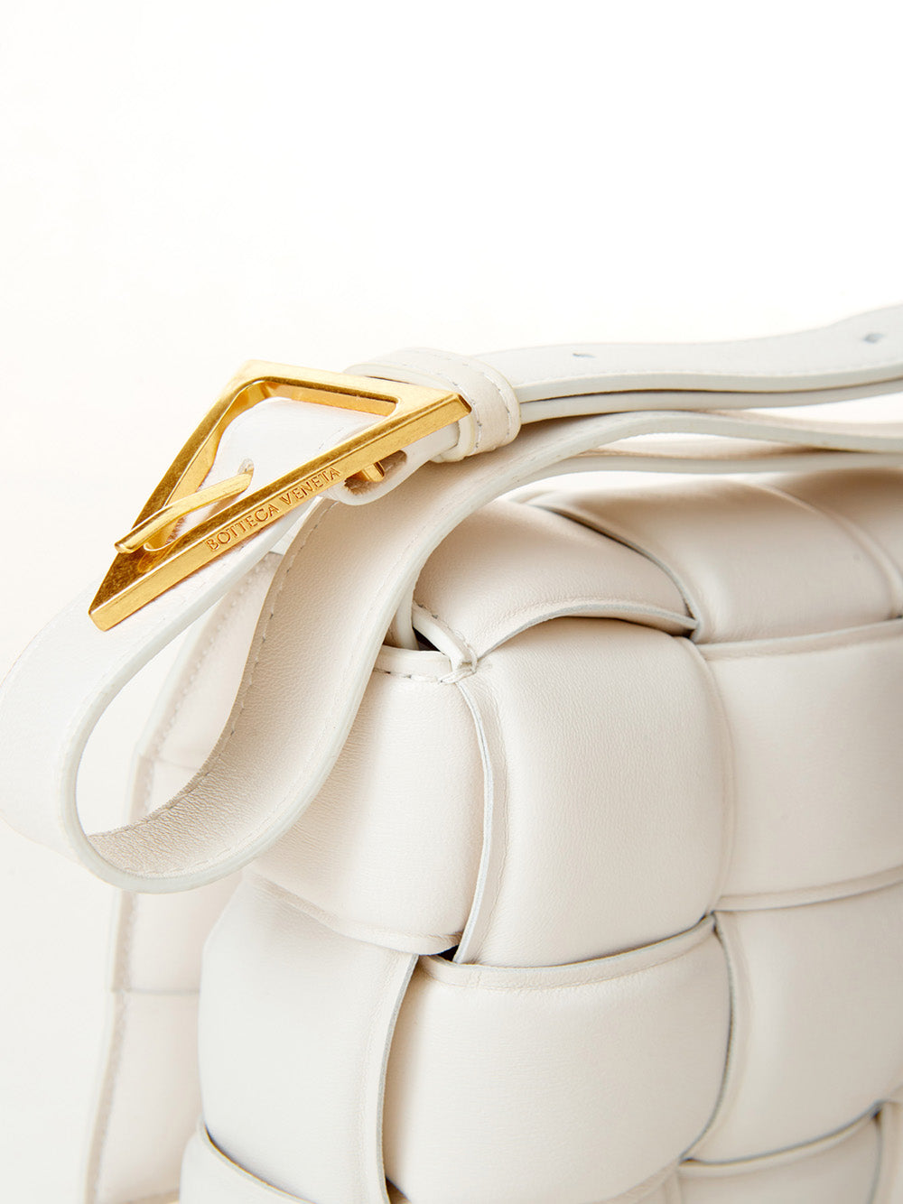 Discover the epitome of sophistication with this immaculate white padded crossbody bag, a testament to the luxurious craftsmanship of Bottega Veneta. This piece is not just a stunning accessory, but a fusion of art and functionality with its signature leather intreccio design. Secure your valuables with elegance using the gold-tone metal hook closure, and organize your essentials with ease in the inner zipped pocket. Designed for the fashion-forward individual, the bag ensures comfort with its adjustable strap, making it ideal for on-the-go style.