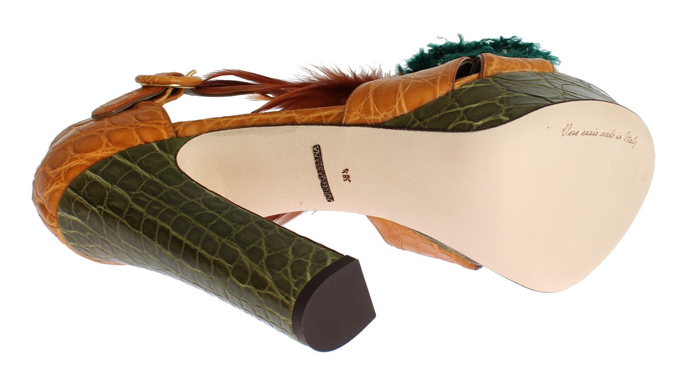 Indulge in the opulence of Dolce & Gabbana with these stunning multicolor crocodile crystal ankle strap platform sandals. With glittering champagne crystals and gold metal detailing, these shoes are a testament to exceptional Italian craftsmanship. The adjustable buckle ensures a perfect fit, making these sandals not only a luxurious choice but also an investment in comfort and style. The bold green and yellow hues will add an eye-catching pop to any outfit, guaranteeing that you’ll stand out in the most elegant way.