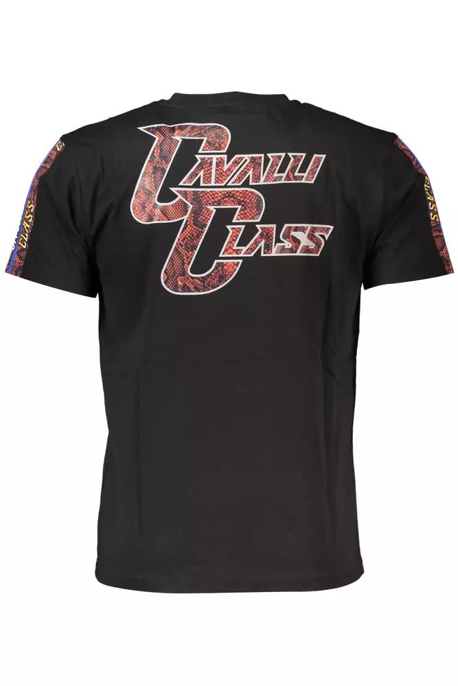 Embrace understated luxury with this meticulously crafted Cavalli Class T-shirt. Designed for a refined yet casual aesthetic, it features short sleeves, a comfortable regular fit, and a classic round neck. The bold print and logo embellishment subtly enhance its sleek black hue, making it a versatile addition to any fashion-savvy wardrobe.