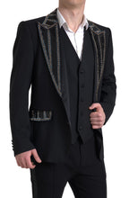 Step into the world of high fashion with this stunning two-piece suit from Dolce & Gabbana. Impeccably crafted with a blend of wool, silk, elastane, and polyester, this suit exudes luxury and elegance. The blazer features a sharp peak lapel, a two-button closure, and a slim fit that will flatter any silhouette, complemented by a vest with a five-button closure and adjustable back strap for the perfect fit. This ensemble is completed with a sleek black color, lending it a timeless appeal that is sure to make a statement at any formal event.