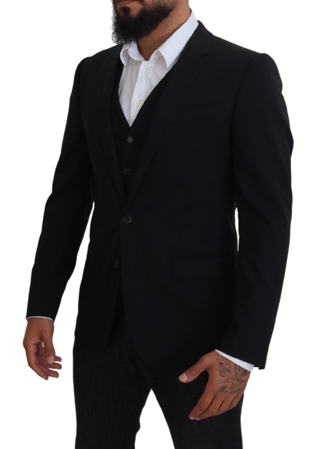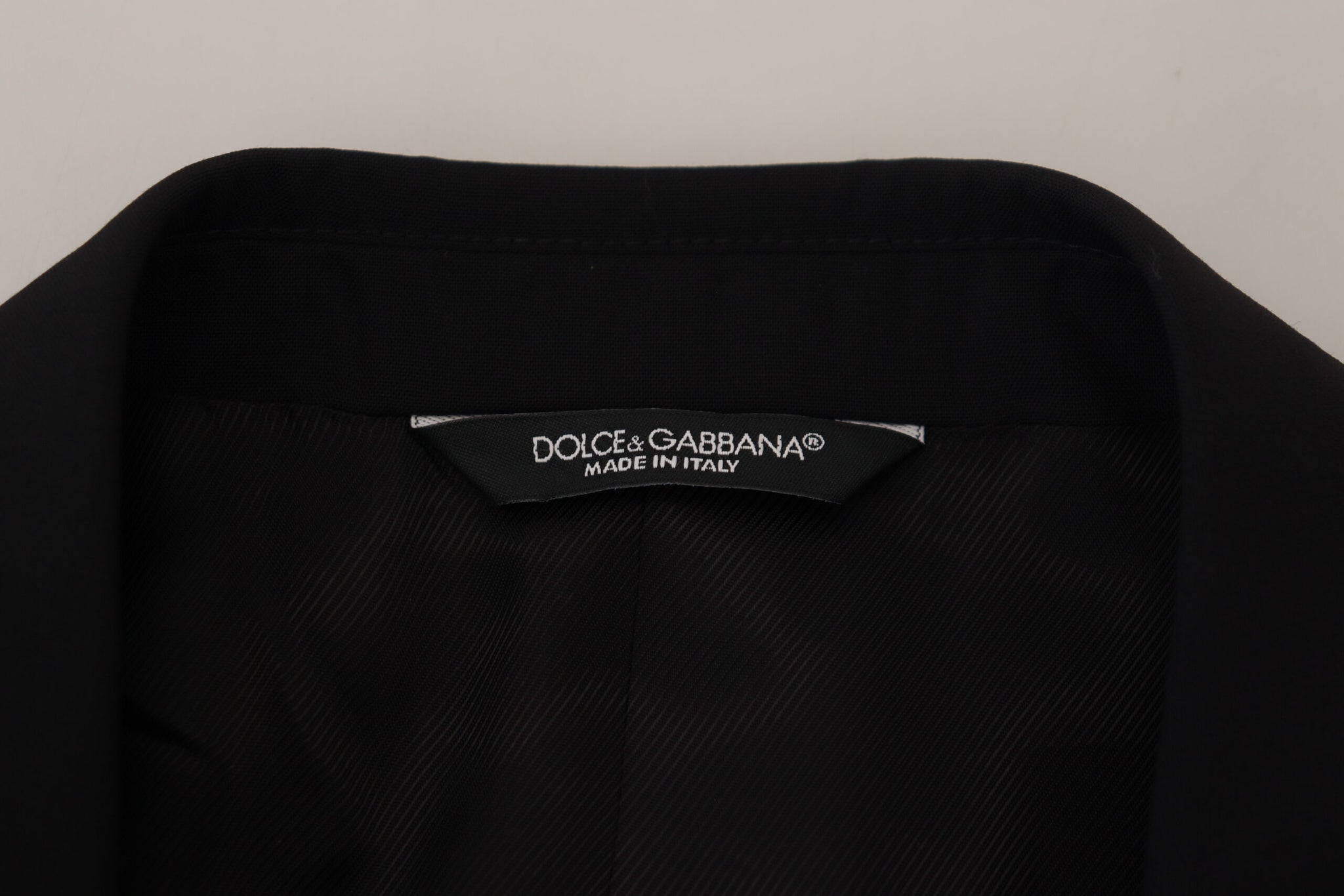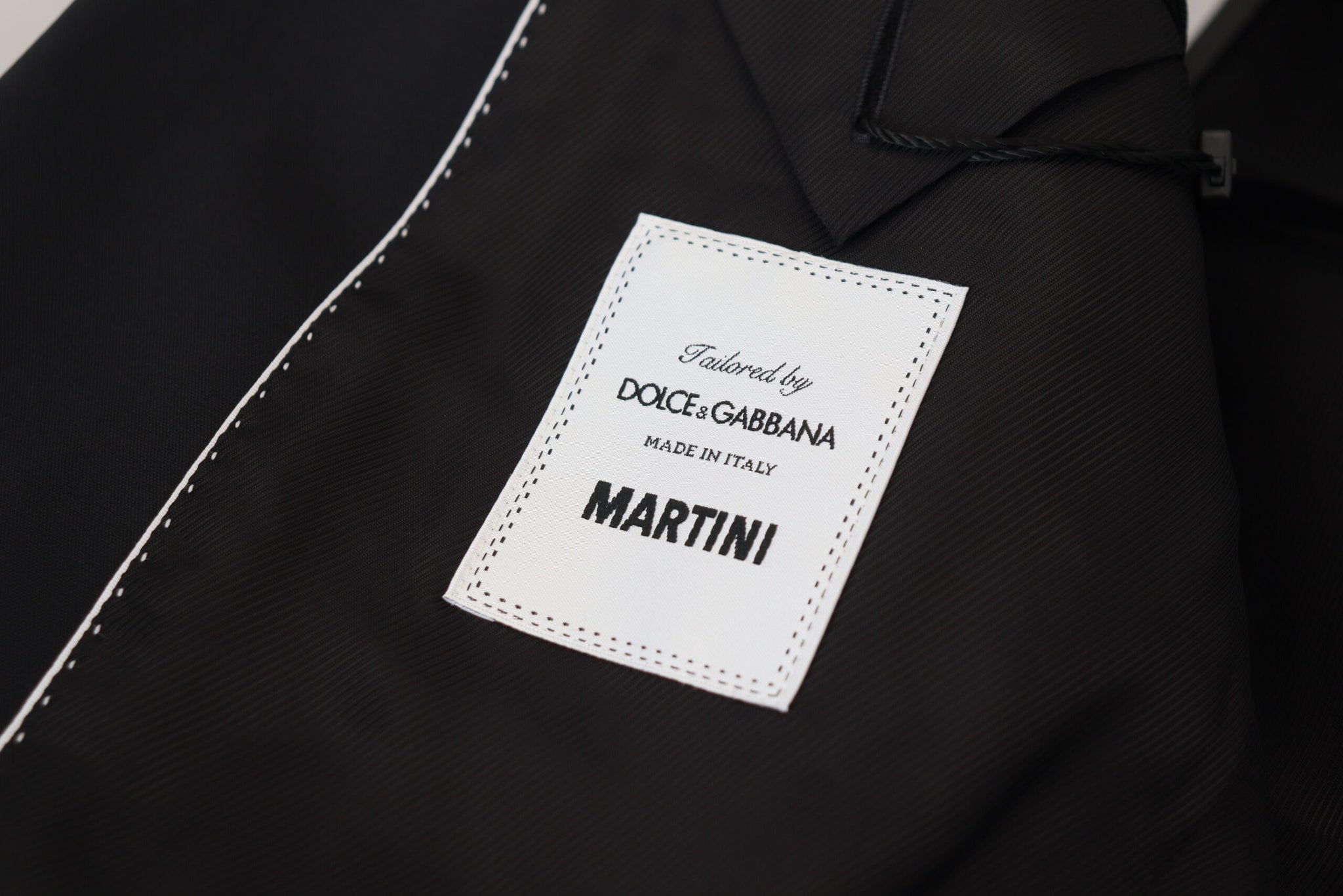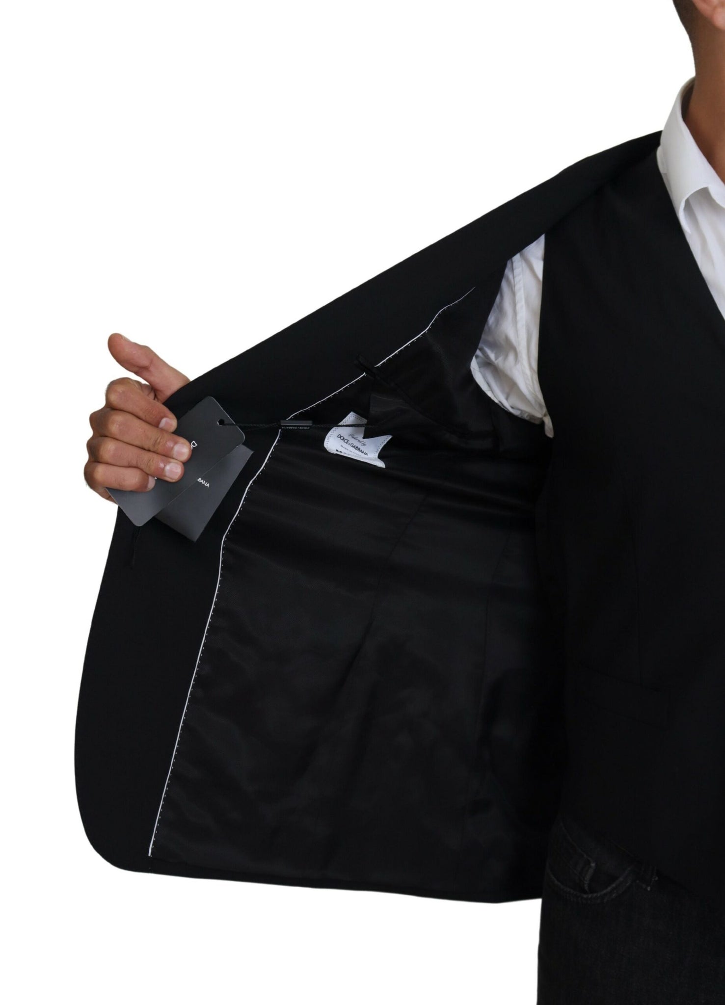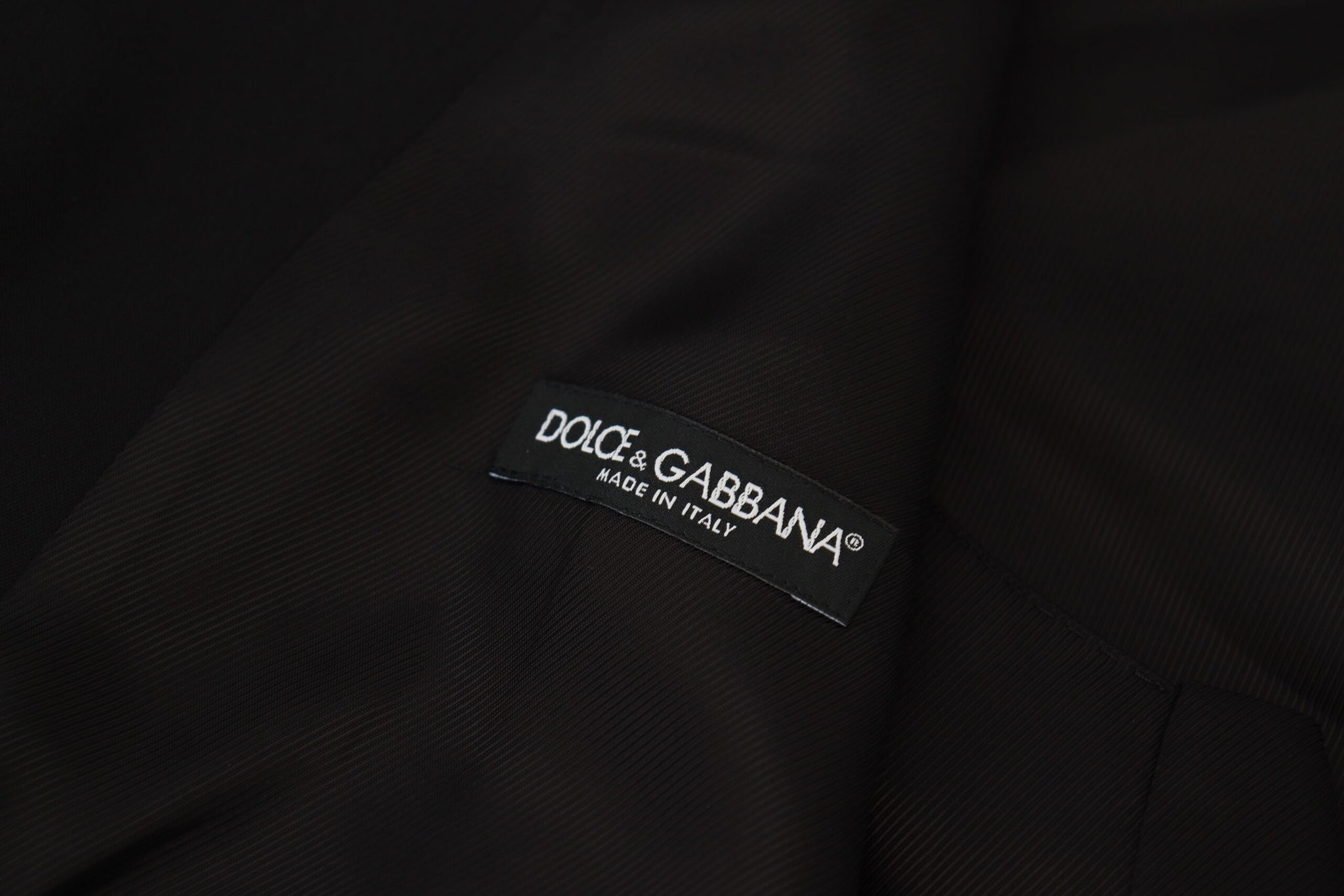 Step into high-end fashion with the exquisite Dolce & Gabbana Martini two-piece suit. Tailored to perfection, this black single-breasted blazer and matching vest ensemble exude sophistication and style. Crafted in Italy, the suit features a sleek two-button closure on the jacket and a full-buttoned vest with an adjustable strap for the perfect fit. The blend of virgin wool and elastane ensures a luxurious feel and a comfortable drape.