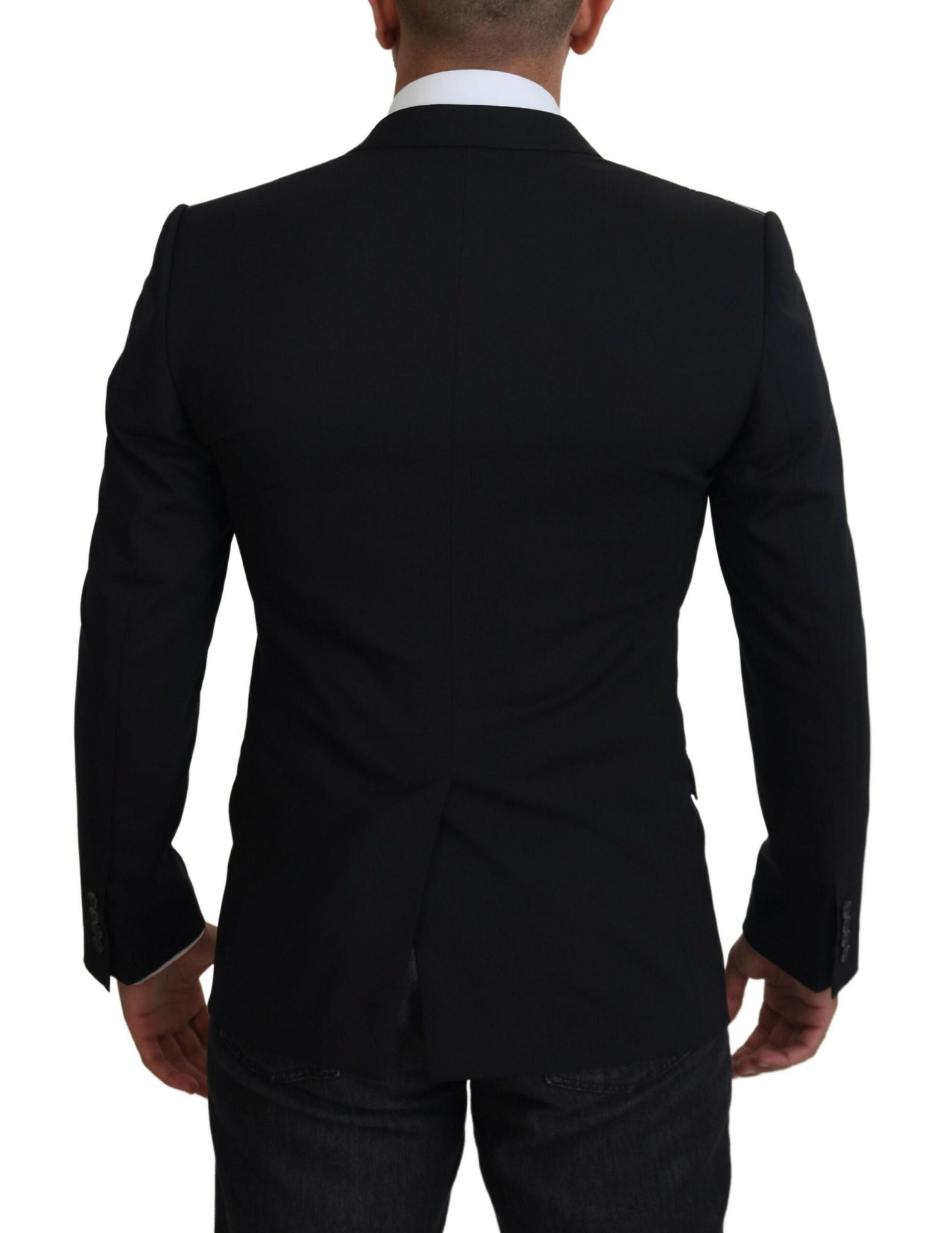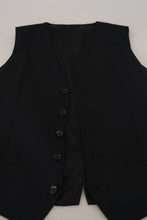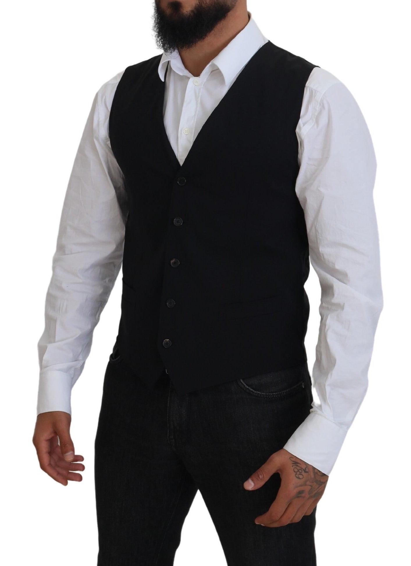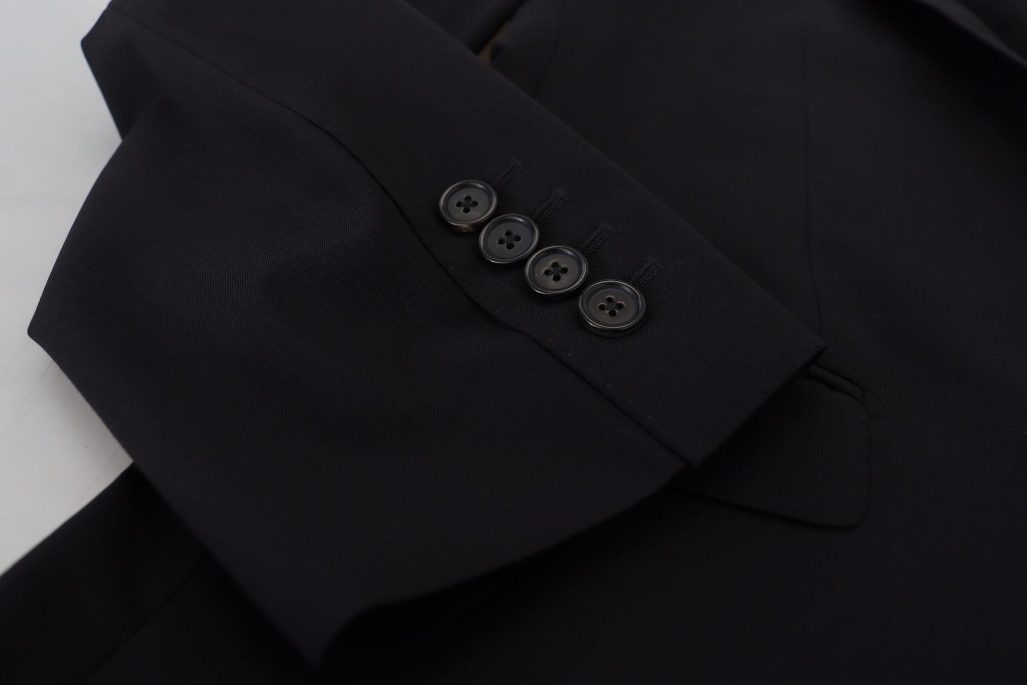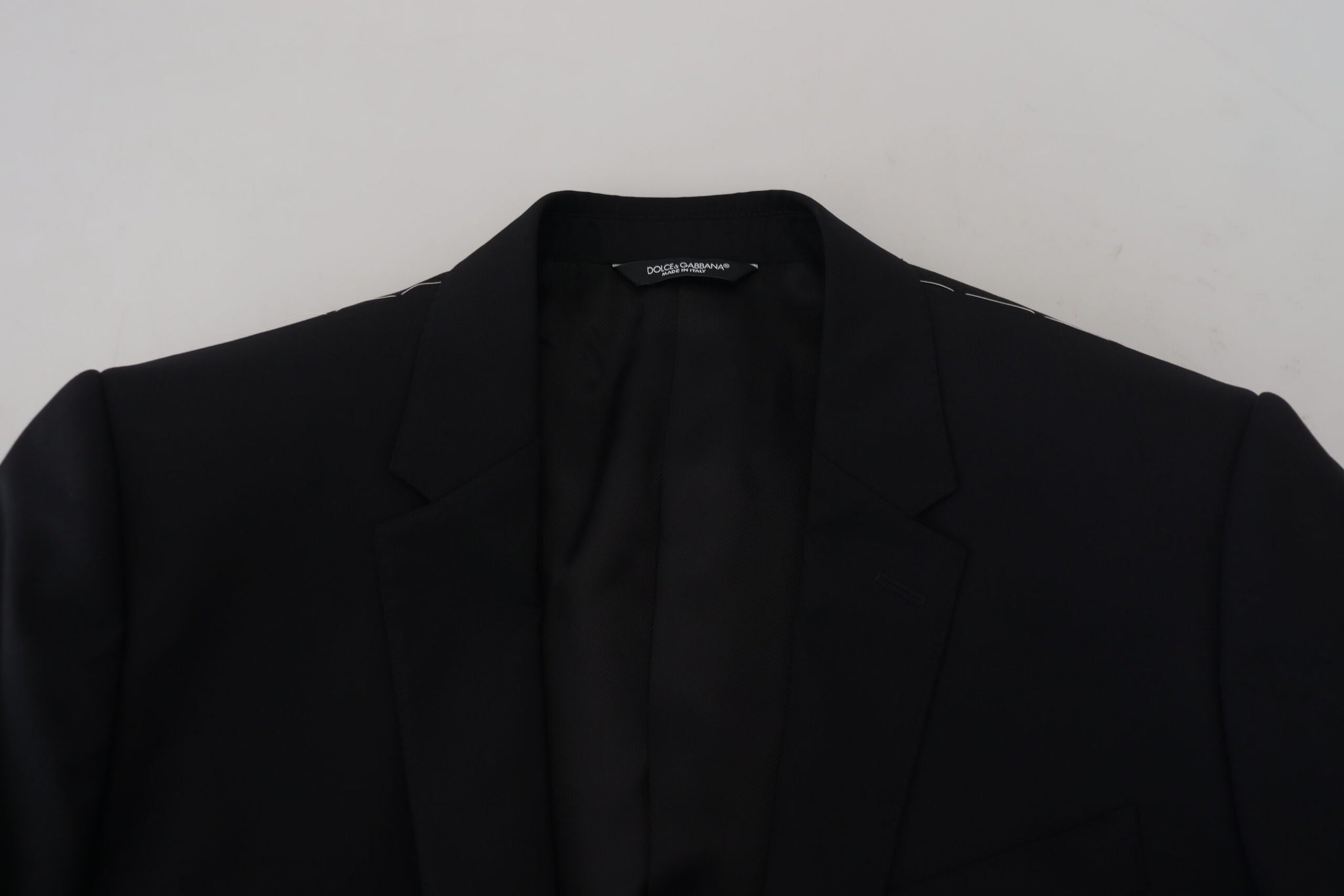 Step into high-end fashion with the exquisite Dolce & Gabbana Martini two-piece suit. Tailored to perfection, this black single-breasted blazer and matching vest ensemble exude sophistication and style. Crafted in Italy, the suit features a sleek two-button closure on the jacket and a full-buttoned vest with an adjustable strap for the perfect fit. The blend of virgin wool and elastane ensures a luxurious feel and a comfortable drape.