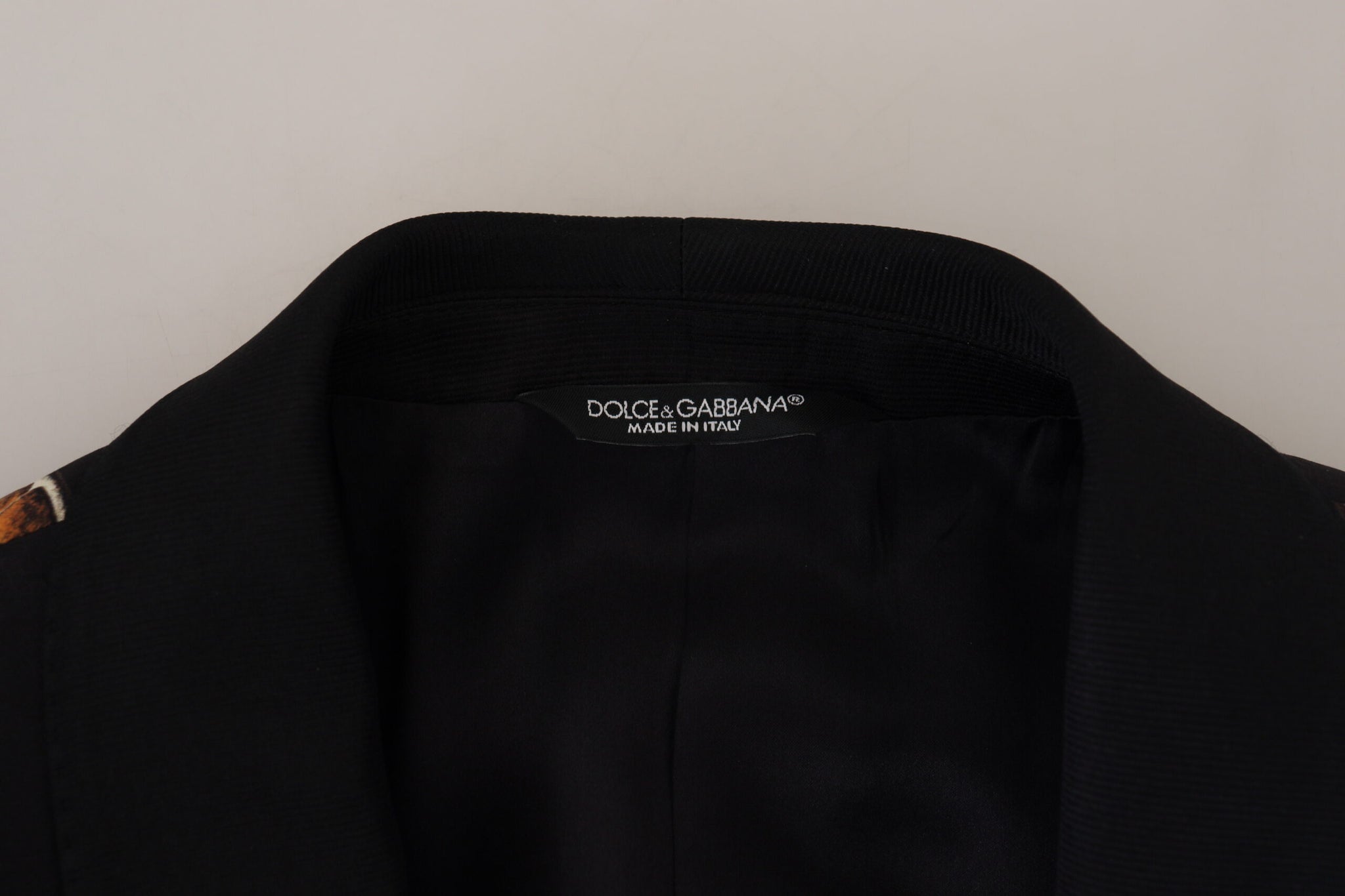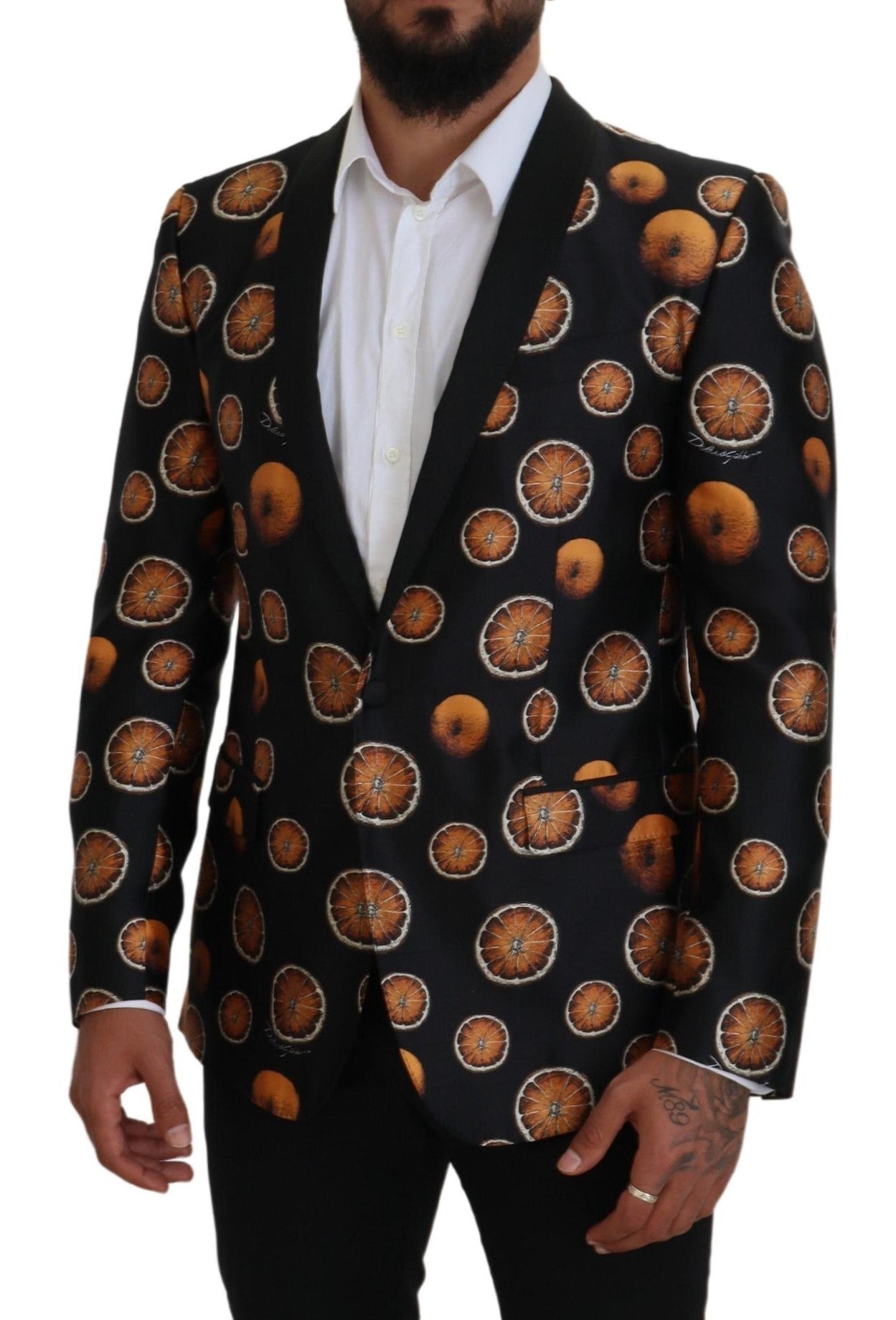 Immerse in the epitome of luxury with this Dolce & Gabbana Blazer, a piece that redefines sophistication. Perfect for formal events, this single-breasted ‘MARTINI’ model is expertly crafted in Italy. The gorgeous orange print accents create a striking yet elegant contrast against the timeless black, ensuring you make an unforgettable statement at any occasion.