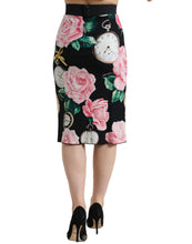 Discover the epitome of Italian elegance with this stunning high-waisted pencil midi skirt from Dolce & Gabbana. The luxurious blend of silk and elastane ensures both comfort and style, with a gorgeous black backdrop adorned by a vibrant multicolored floral print, including roses and a unique clock design. Perfect for creating a sophisticated and chic look that stands out. It’s not just a garment; it’s a statement piece that symbolizes the blend of tradition and modern fashion sensibilities, crafted with the exceptional quality Dolce & Gabbana is celebrated for.