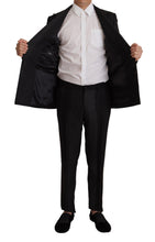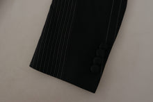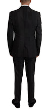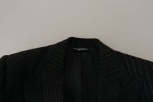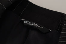 Indulge in the essence of sophistication with this absolutely stunning black striped two-piece suit from Dolce & Gabbana. Tailored to perfection, the suit boasts a double-breasted blazer featuring peak lapels, button cuffs, along with a chest pocket and side flap pockets for a classic touch. The slim-fit design ensures a sharp silhouette, while the trousers complete the attire with a mid-rise cut, button and zip fly, alongside side and back pockets for functionality. Crafted in Italy, this suit exemplifies exclusive high craftsmanship with a luxurious blend of fabrics that offer both comfort and style.
