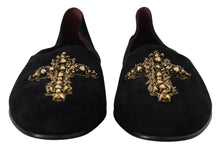 Immerse in the opulence of these Dolce & Gabbana slip-on loafers. Crafted with exquisite attention to detail, these shoes boast a stunning black gold crystal-sequined cross on plush suede, offering unparalleled luxury and style. Perfect for discerning gentlemen who seek elegance and a touch of splendor in their footwear.