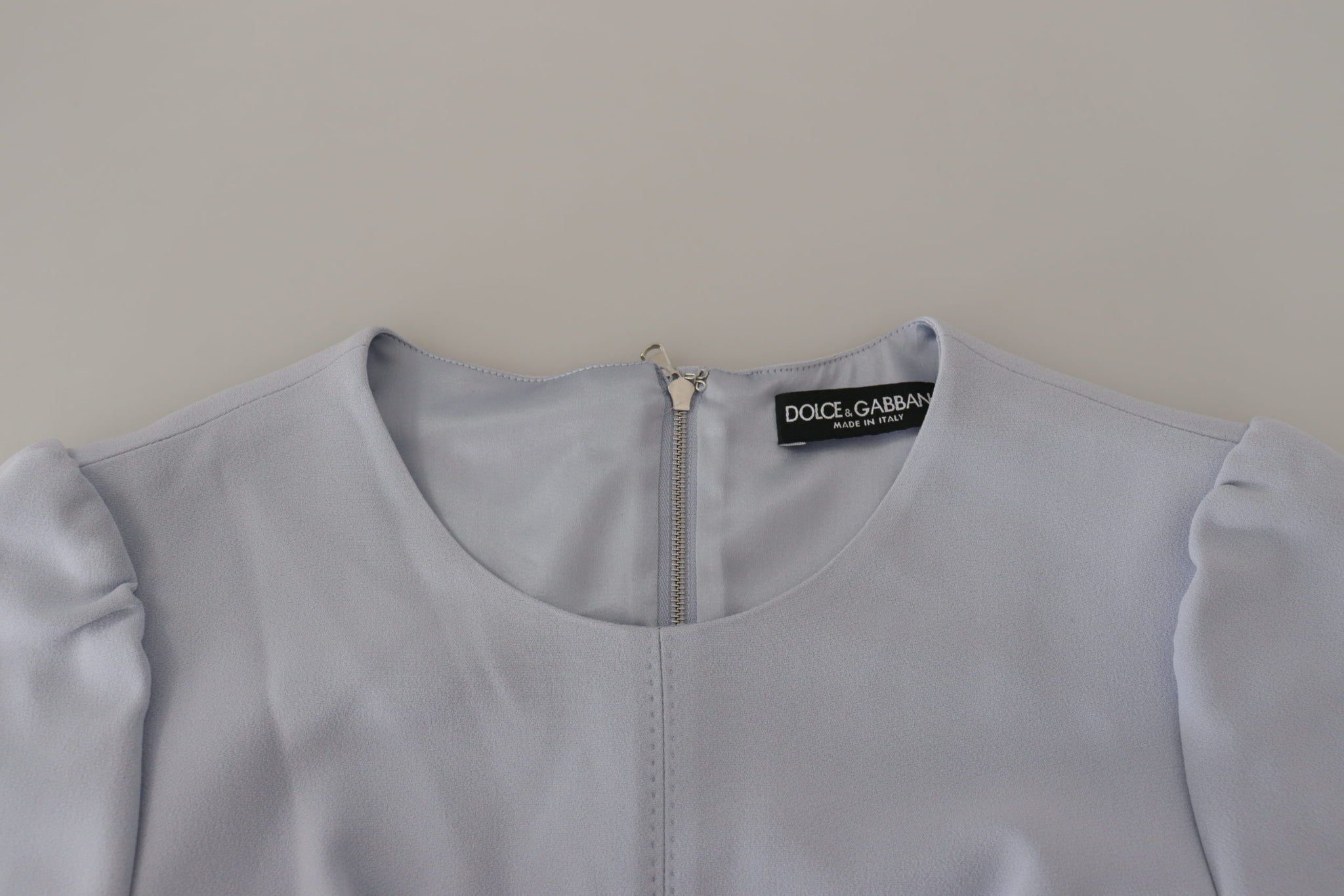 Indulge in the epitome of Italian elegance with this sophisticated A-line dress by Dolce & Gabbana. Perfect for making a statement at any high-end event, the dress boasts a gorgeous light blue hue and a flattering slim fit design that accentuates your figure beautifully. Complete with a concealed back zip closure for a seamless look and crafted with a luxurious blend of materials, this mid-length dress exudes charm and class.