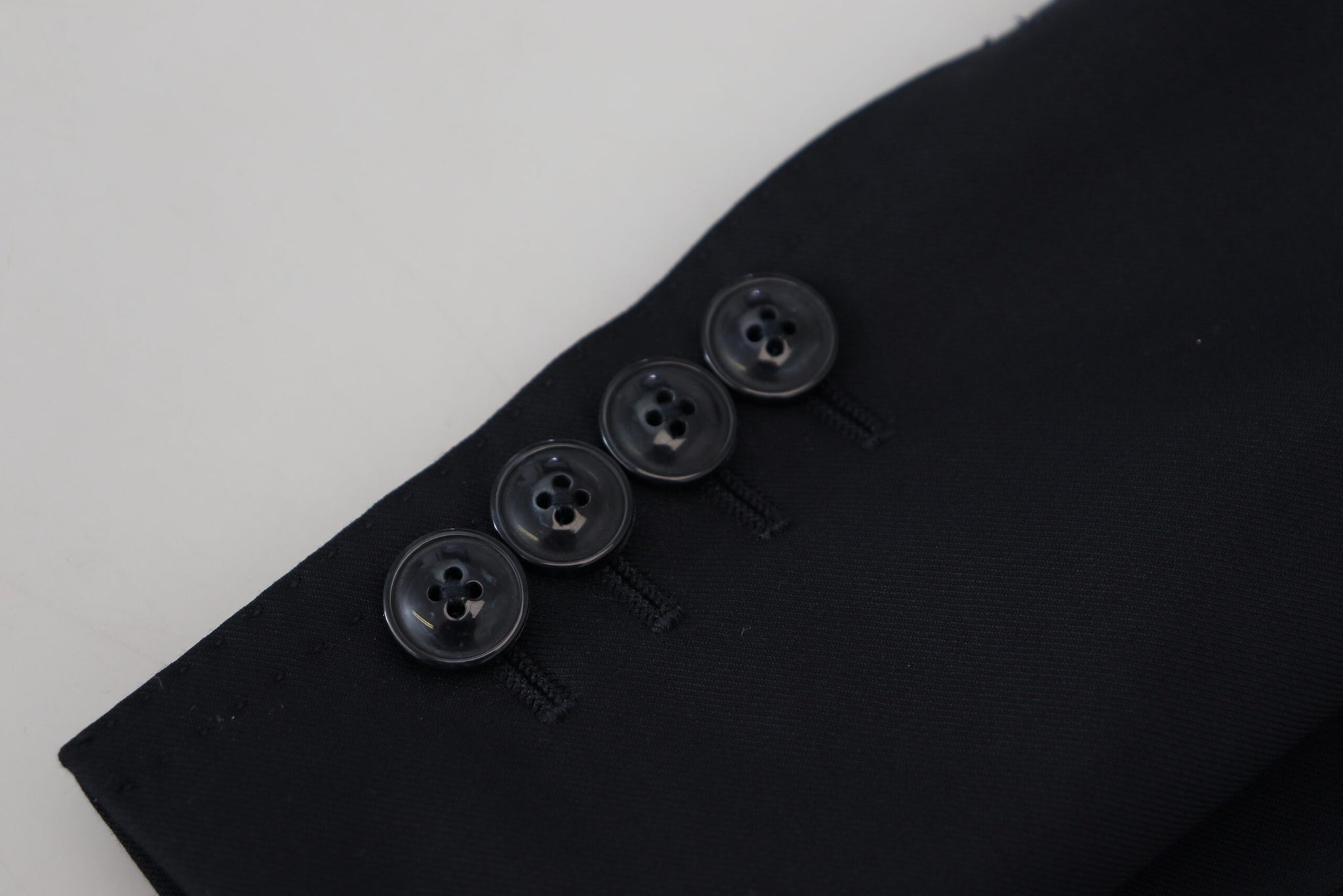 Exude sophistication with this 100% Authentic Dolce & Gabbana dark blue blazer. Tailored to perfection, this piece is ideal for formal occasions, to make a standout statement while maintaining a classic silhouette. Its fine wool construction promises luxurious comfort and unparalleled style. Proudly made in Italy, it features a smart single-breasted design, complete with sharp two button closure and practical front pockets, all finished with the subtle refinement of logo detailing.