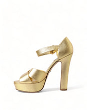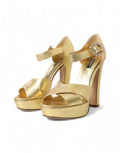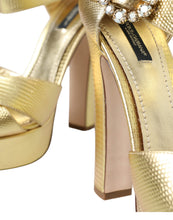 Step into luxury with these exquisite, brand new gold platform sandals from Dolce & Gabbana. Adorned with sparkling crystal embellishments, these leather ankle strap sandals are designed to make a lasting impression at any high-end event or night out. Made in Italy with meticulous attention to detail, they are not just shoes but a statement of elegance.