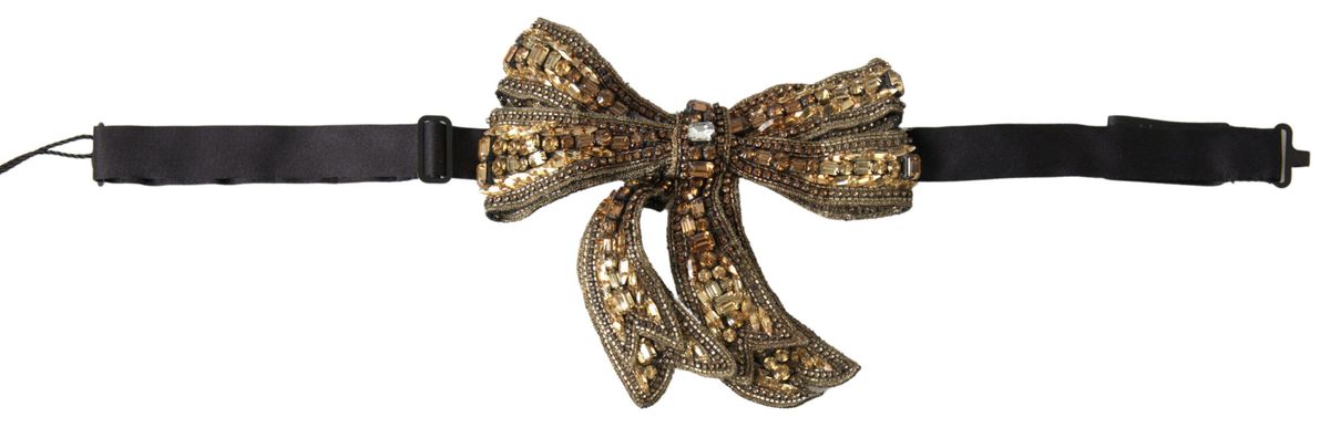 Indulge in the luxury of Dolce & Gabbana with this exquisite gold embellished bowtie. Crafted from pure silk and adorned with champagne and gold crystals and beads, this bowtie adds a touch of elegance to any ensemble. Complete with logo details and presented in a beautiful box, it’s perfect for those who appreciate the finer details in their accessories. Made in Italy, this bowtie epitomizes the brand’s dedication to craftsmanship and style.
