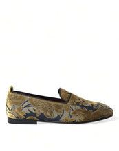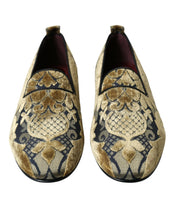 Gorgeous brand new with tags, 100% Authentic Dolce & Gabbana smoking slippers. Exuding royalty in gold velvet brocade, they feature round toes and pull tabs on the counters. Satin-lined insoles.