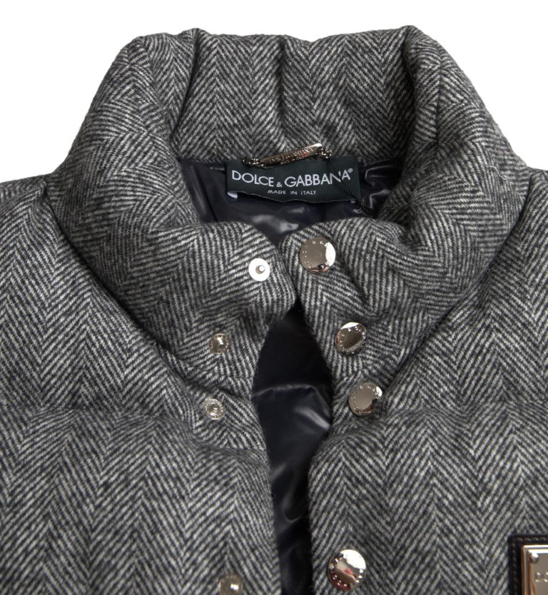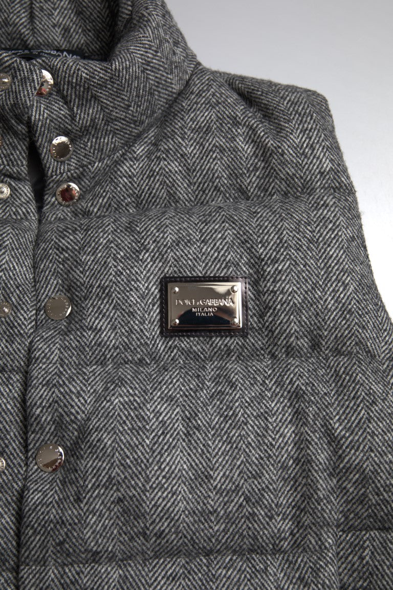 Discover luxurious warmth and style with our Dolce & Gabbana vest jacket. Perfect for layering, this sophisticated gray piece boasts a refined chevron knit crafted from a premium virgin wool blend. Featuring a sleek logo plaque and a padded design that exudes comfort without compromising on elegance. The high neck and sleeveless cut make it an ideal choice for transitioning between seasons, while the press-stud fastening ensures a seamless silhouette. Finished with two handy side slit pockets, it’s as practical as it is chic, and fully buttoned up for a polished look. Made in Italy, this vest promises an unmatched level of craftsmanship and luxury.