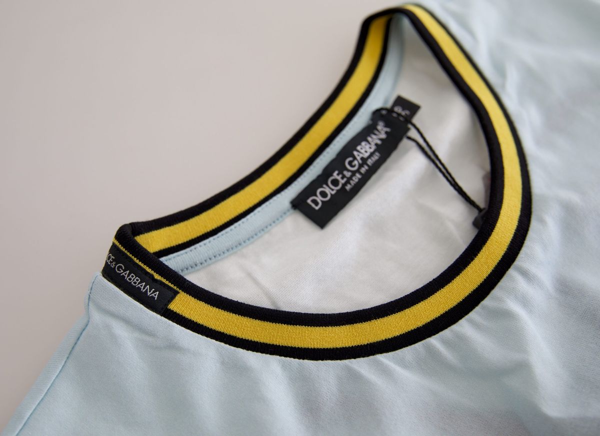 Discover the epitome of Italian elegance with this gorgeous, 100% Authentic Dolce & Gabbana light blue crew neck t-shirt. Perfect for adding a touch of sophistication to any outfit, this t-shirt blends comfort with the high-end style that Dolce & Gabbana is renowned for. Complete your wardrobe with this stunning piece, made in Italy and adorned with subtle logo details.