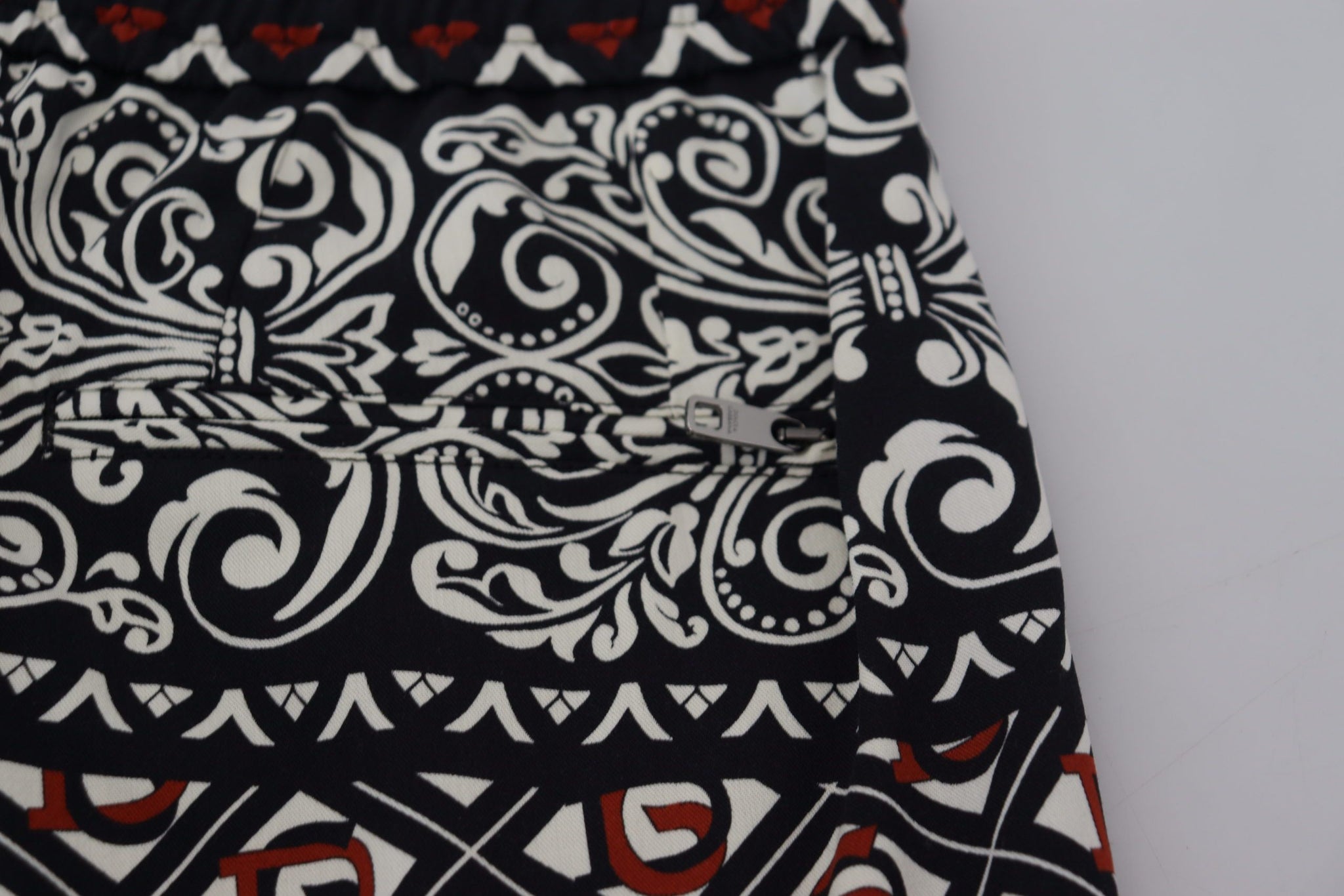 Indulge in the ultimate blend of luxury and comfort with these exquisite multicolor jogging pants from Dolce & Gabbana. Crafted from a sumptuous mix of wool, PA, and a touch of elastane, these pants guarantee both style and a perfect fit. A standout piece with a unique black and white baroque pattern, regular fitting silhouette, and thoughtfully designed with multiple zippered pockets and an elastic waistband with a drawstring for personalized comfort. These trousers not only embody Dolce & Gabbana’s signature attention to detail but also their dedication to high-quality craftsmanship right from Italy. Upgrade your casual wardrobe with these eye-catching joggers.