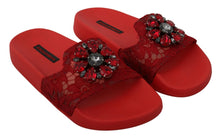 Indulge in the elegance of Dolce & Gabbana with these exquisite red floral lace slide flats, perfect for adding a touch of luxury to your beachwear. Adorned with sparkling red and gray crystals, these flats are designed to provide both comfort and style. Crafted with a combination of cotton, polyamide, and viscose, they feature rubber soles for durability and are finished with the iconic logo details to exude Italian craftsmanship at its finest.