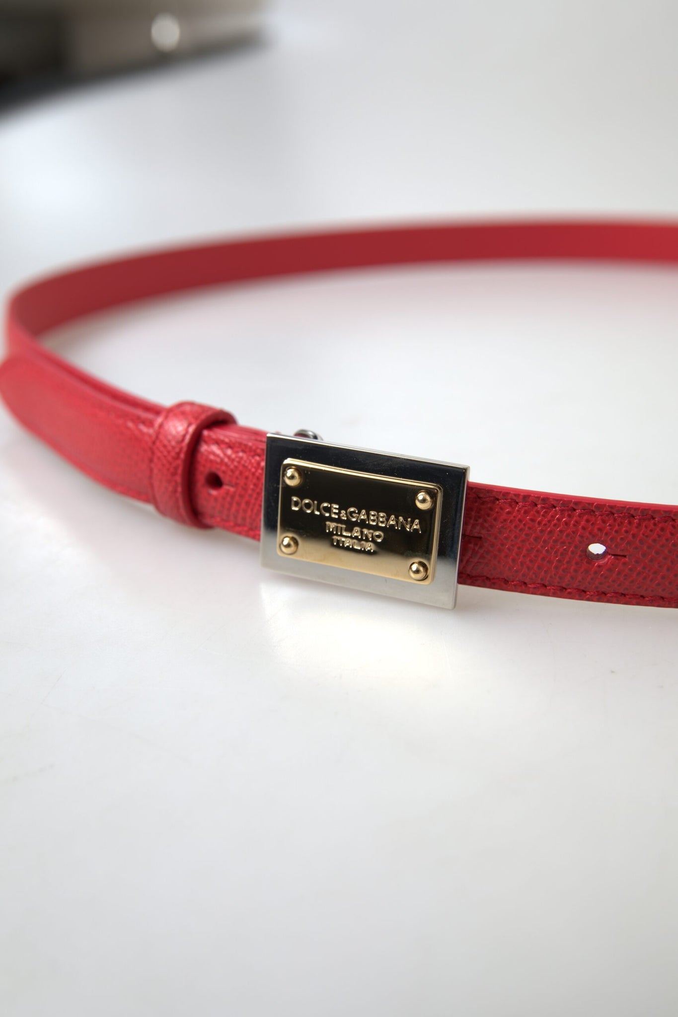 Elevate your ensemble with this striking red leather belt from Dolce & Gabbana. This gorgeous accessory comes brand new with tags and box, ensuring its pristine condition. The belt showcases a chic metal logo-engraved buckle that adds a touch of luxury to any outfit.