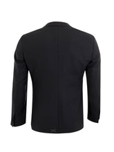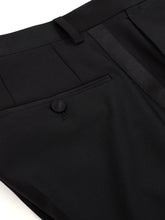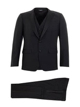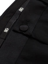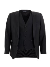 Step into a world of sophistication with our exquisite black three-piece suit from Dolce & Gabbana. This timeless ensemble, brand new with tags, is tailored to perfection, offering a sharp silhouette. The jacket features a classic two-button closure, front pockets, and an elegant small side pocket, all highlighted by the luxurious satin-covered buttons. The trousers resonate with the smoking style, boasting five pockets and a refined satin strip detail along the side. A covered button closure and zip draw the piece together seamlessly. Completing the set is a handsome vest with a sleek satin button closure, sleeveless design, and two front pockets against a contrasting satin back.