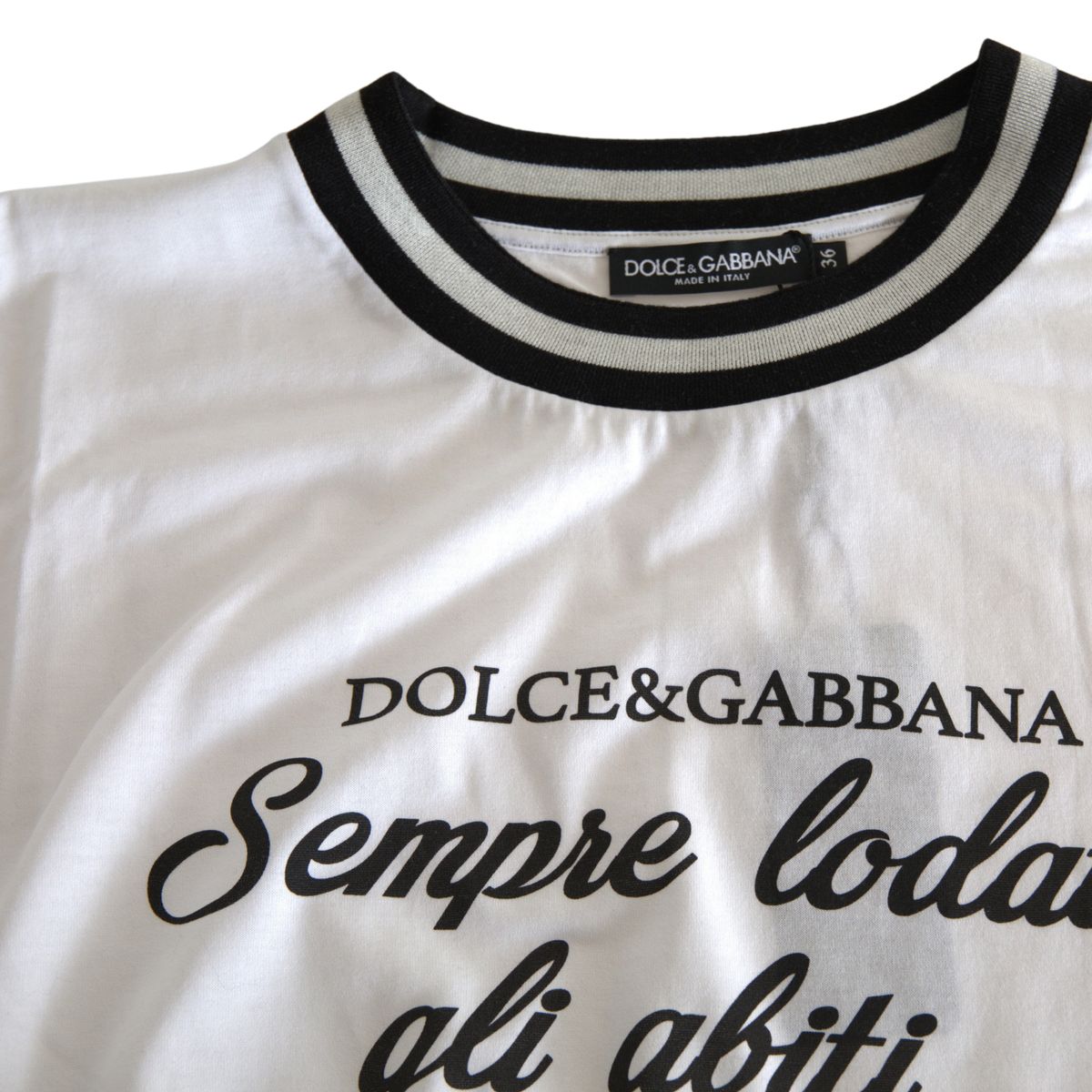 Step out in style with this gorgeous and 100% authentic crew neck t-shirt from Dolce & Gabbana. A perfect blend of comfort and luxury, tailored from the finest 100% cotton material to ensure a soft and breathable fit. Designed in Italy, this pristine white tee showcases the iconic logo details, adding a touch of class to your casual wardrobe.