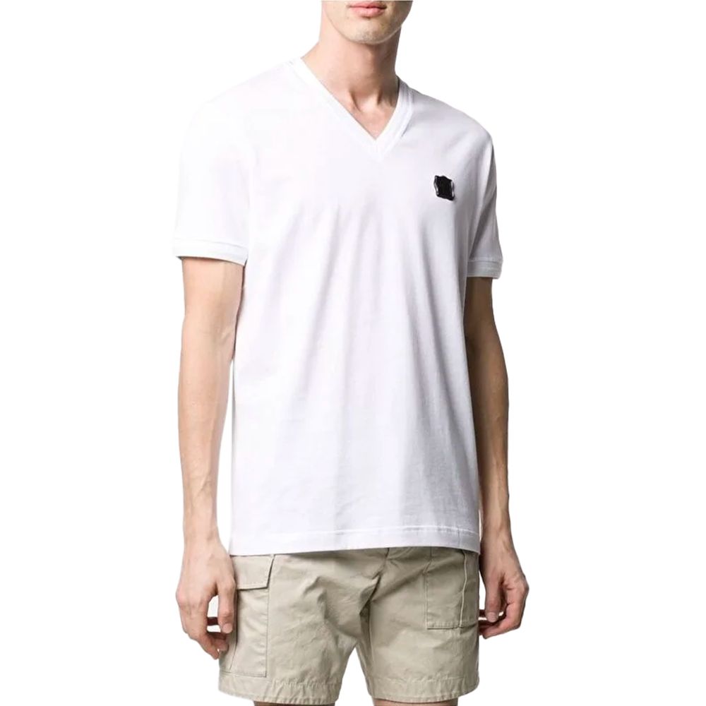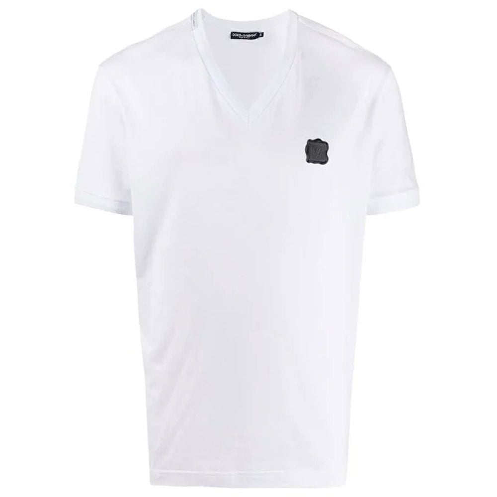Step into effortless style with this pristine white V-neck t-shirt by Dolce & Gabbana. Crafted from 100% pure cotton for maximum comfort and breathability, this tee features an embossed black rubber logo on the chest, adding a touch of luxury to your casual wardrobe.