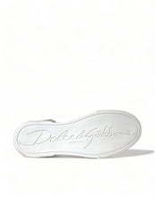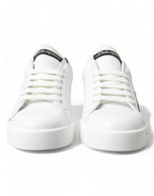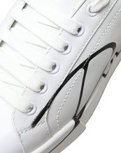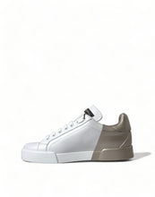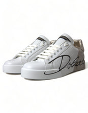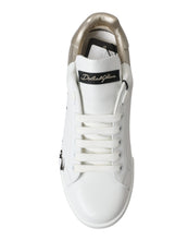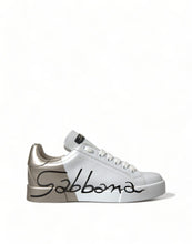 Step up your sneaker game with these exquisite White and Gold Portofino Lace-up Sneakers from Dolce & Gabbana. These luxurious sneakers are more than just footwear; they are a testament to high quality and craftsmanship, direct from the sunny shores of Italy. The bold black logo print contrasts beautifully against the pure white leather, with dazzling gold accents that add an opulent touch to any outfit. Whether for casual outings or high-fashion events, these sneakers are designed to stand out.
