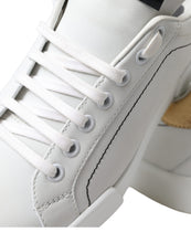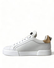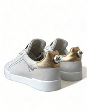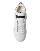 Step into luxury with our immaculate, 100% Authentic Dolce & Gabbana Portofino sneakers. These gorgeous, brand new, tag-included sneakers blend elegance with a casual flair. The matte smooth leather pairs splendidly with a striking gold heel tab, while the faux pearl and logo adornment on the tongue infuse a touch of opulent branding. Crafted with meticulous high craftsmanship in Italy, the durable rubber sole ensures long-lasting wear in utmost style.