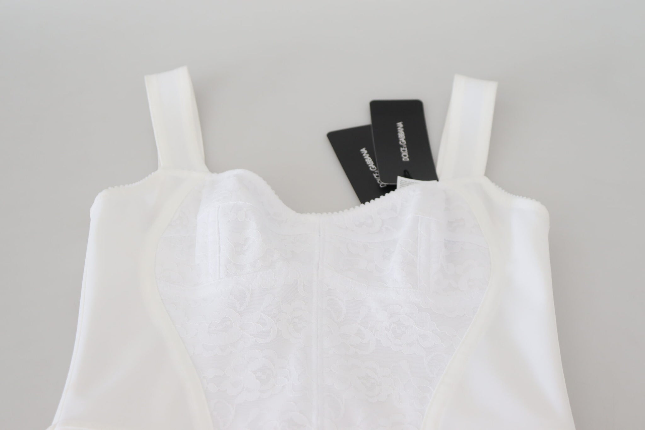 Step into elegance with this exquisite Dolce & Gabbana knee-length dress. A perfect blend of style and comfort, this bodycon dress is designed to accentuate your silhouette with its snug stretch fit. Crafted in Italy, this luxurious white dress is adorned with subtle logo details and comes with a convenient zipper closure, making it as functional as it is fashionable.