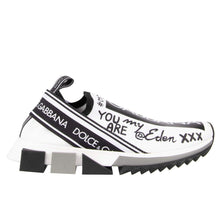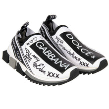 Indulge in Italian elegance with these Dolce & Gabbana stretch sneakers. Designed with a fashion-forward black and white print and unique script detailing, these shoes are the epitome of luxury sports chic. They feature a square-cut rubber sole that provides both comfort and style. Perfectly crafted in Italy to elevate your casual footwear collection.