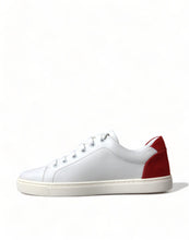 Step into luxury with these exquisite low-top sneakers from Dolce & Gabbana. Crafted in Italy, these shoes boast high craftsmanship with a sleek white leather exterior and bold red detailing. The classic lace-up design is complemented by a crisp white sole, featuring the brand’s iconic logo. Perfect for adding a touch of elegance to any casual look.