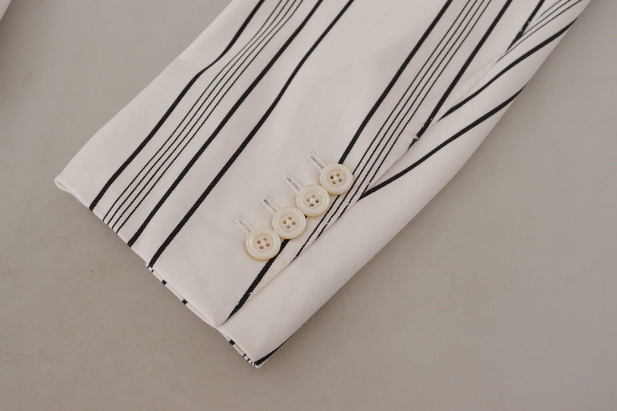 Embrace sophistication with Dolce & Gabbana’s expertly tailored single-breasted jacket. Crafted from a premium cotton blend, this blazer boasts a crisp white hue, accented with subtle stripes for a refined aesthetic. The notch lapel adds a classic touch, while the silk lining ensures a luxurious feel. Designed with meticulous Italian craftsmanship, this piece is a testament to both style and exclusivity.