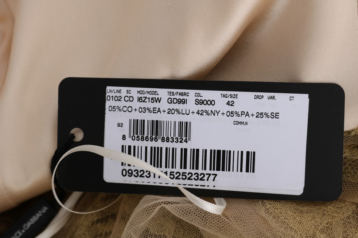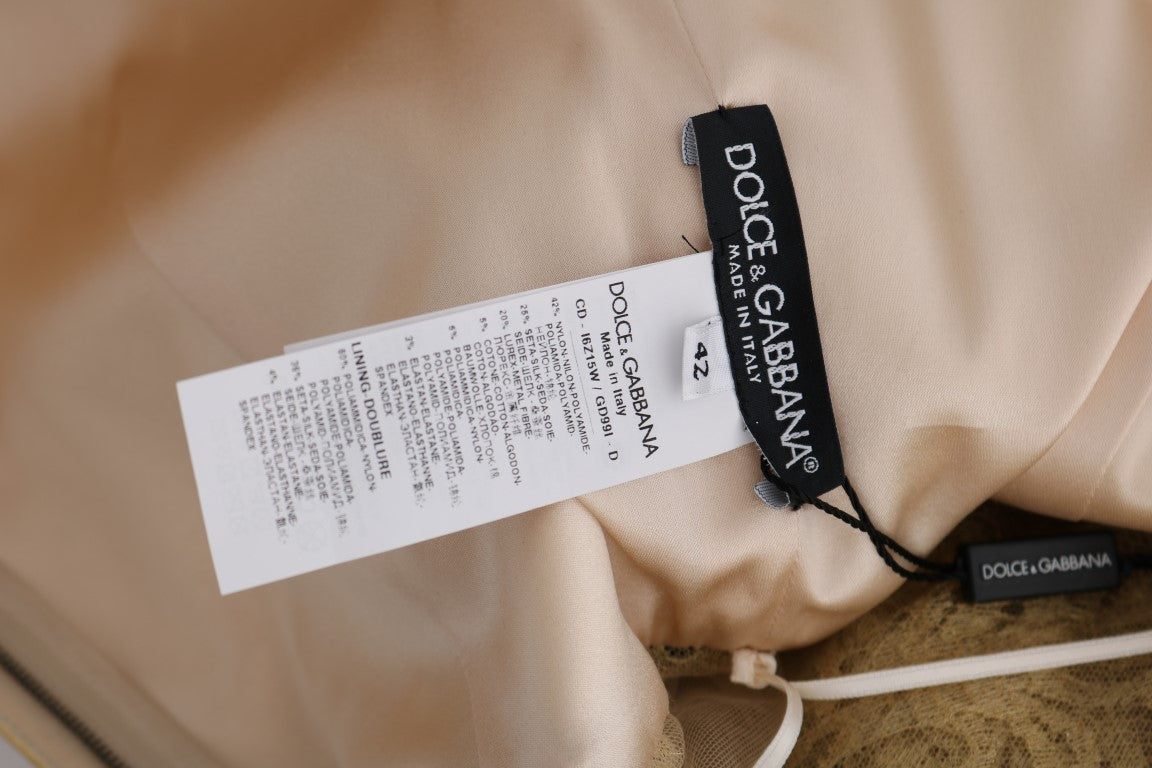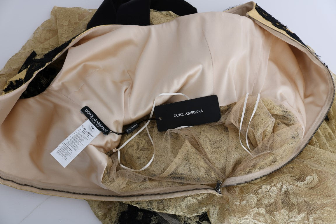 Step into a world of elegance with this exquisite Dolce & Gabbana gold and black floral lace gown dress. Perfect for the most luxurious events, this dress promises to turn heads and accentuate your grace. Crafted with precision in Italy, this long sheath dress is a testament to high craftsmanship and exclusive style. The stretch silk lining ensures a comfortable fit, while the black floral lace overlay exudes sophistication and charm.