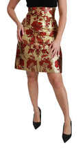 Exude elegance with this exquisite Dolce & Gabbana skirt, a testament to high fashion and unique design. Gleaming in gold with a luxurious red jacquard floral pattern, this above knee, high-waisted masterpiece promises to elevate any wardrobe. Crafted with a silk stretch inner lining for ultimate comfort and flaunting a meticulous Italian construction, it’s finished with a smooth zipper closure and subtle logo accents. Perfect for making a statement at any high-end event or a sophisticated night out.