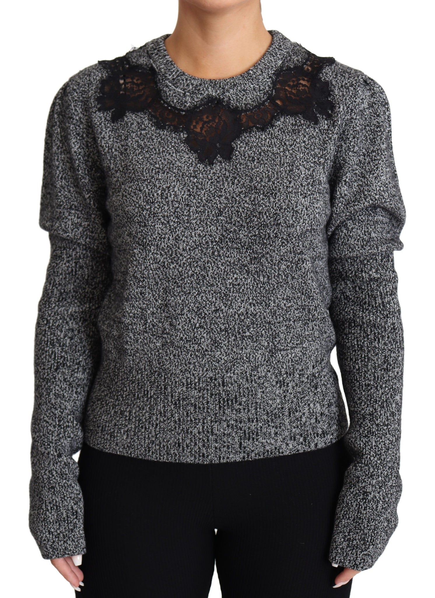 Embrace the epitome of Italian luxury with this exquisite Dolce & Gabbana crewneck rib-knit sweater. Beautifully constructed with a blend of the finest cashmere, cotton, and nylon, this grey and black pullover is a testament to sophisticated style. Adorned with delicate lace trimming and featuring an elasticated collar, bottom hem, and cuffs, this piece combines both comfort and elegance. Ideal for fashion-forward individuals who appreciate the allure of high-end craftsmanship.