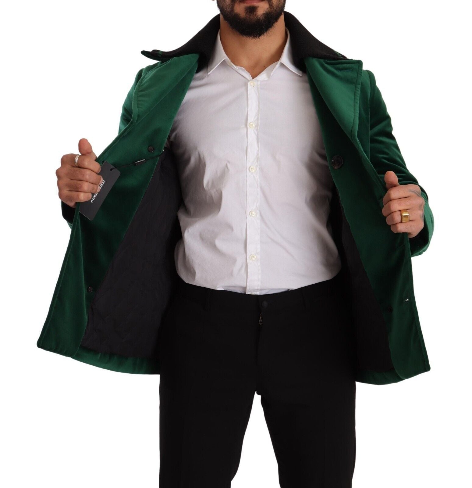 Step into luxury with this stunning Dolce & Gabbana velvet overcoat. This double-breasted green jacket is not only a fashion statement but a testament to Italian craftsmanship. With meticulous attention to detail, it features a sophisticated button closure and two front pockets complemented by the brand’s signature logo details. The fine blend of materials promises durability and unparalleled comfort. Make a statement at any event with this exquisite piece.