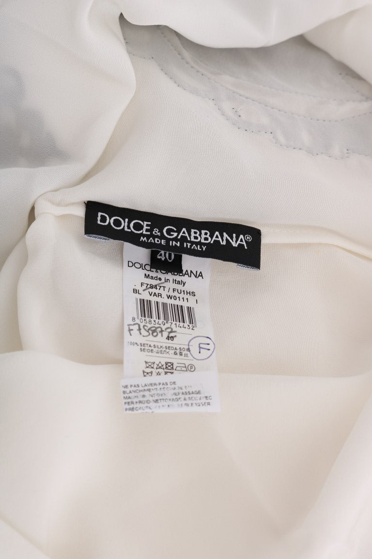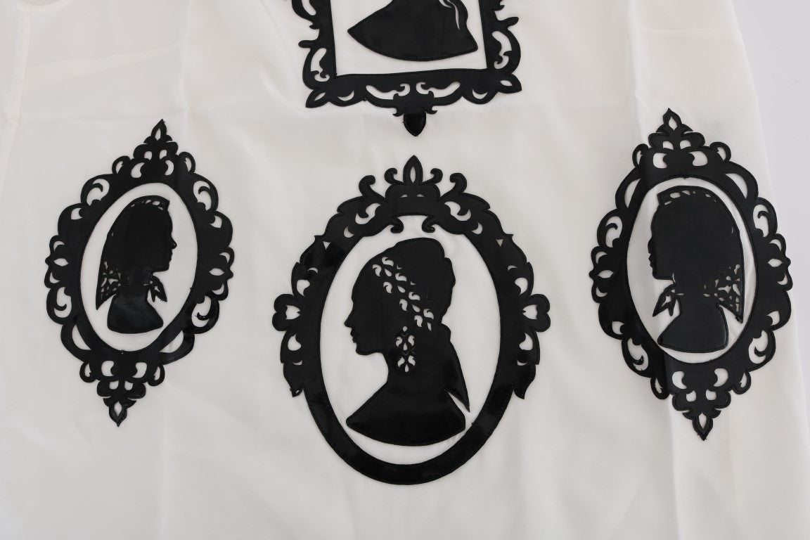 Embrace elegance with this exquisite Dolce & Gabbana blouse, featuring sophisticated Sicily Frame embroidery. Perfect for adding a touch of luxury to any outfit, this 100% silk top is a must-have wardrobe essential. Suitable for a variety of occasions, it seamlessly blends classic charm with modern style. Crafted in Italy, the blouse is synonymous with the quality and design excellence that Dolce & Gabbana is renowned for.